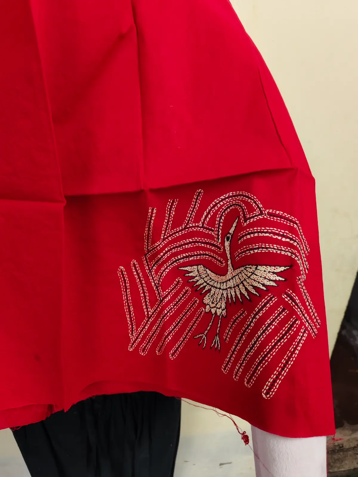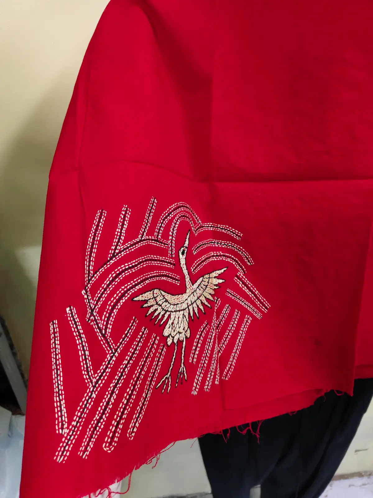 Stunning maroon cotton blouse material featuring a unique hand-embroidered heron, lotus flowers, and leaves. A premium artisanal piece for exclusive designer blouses.