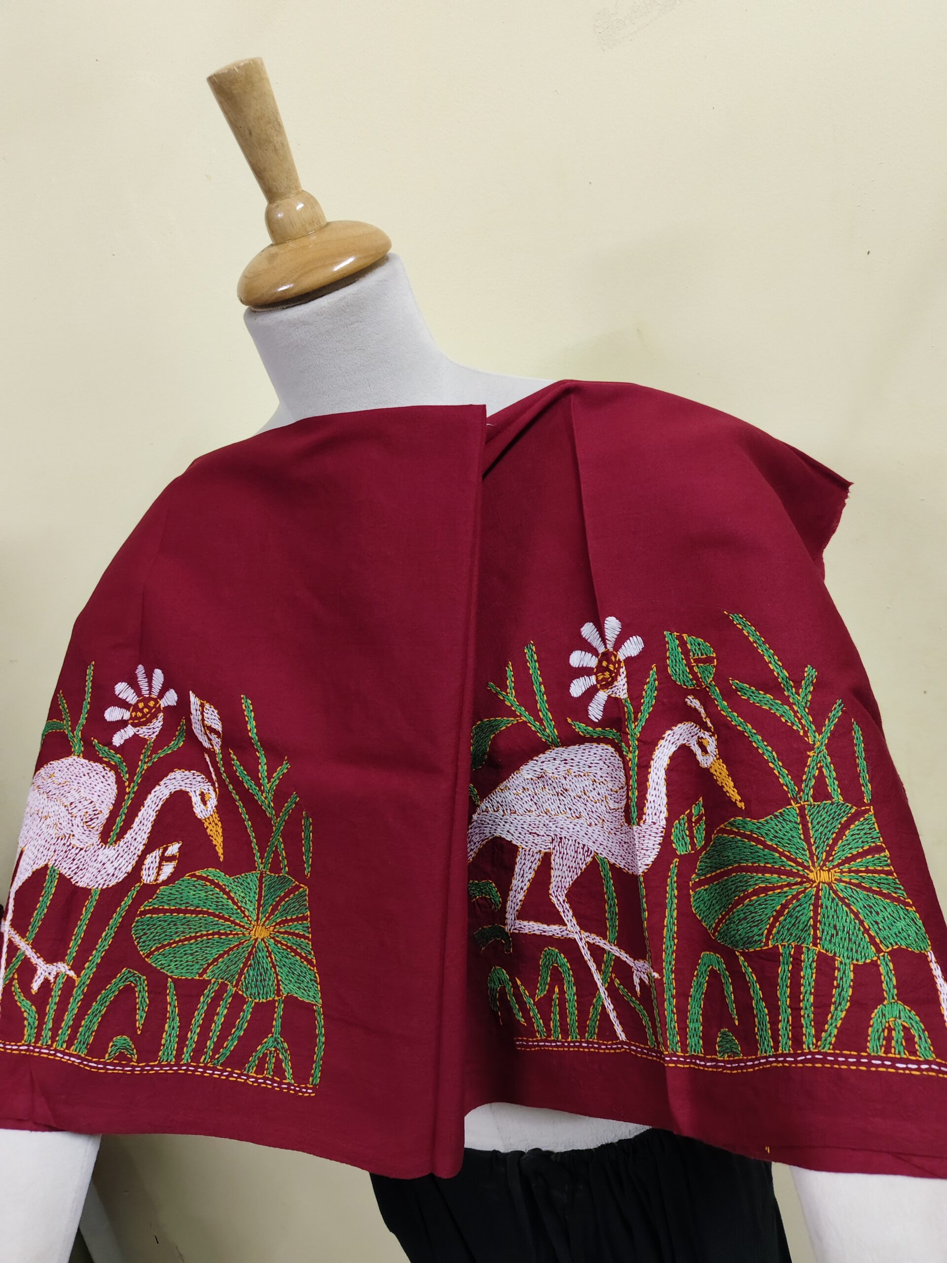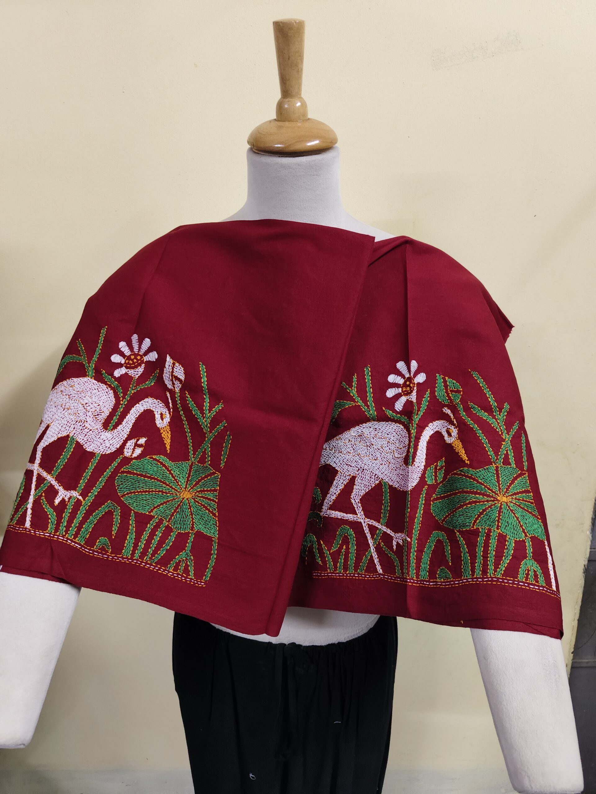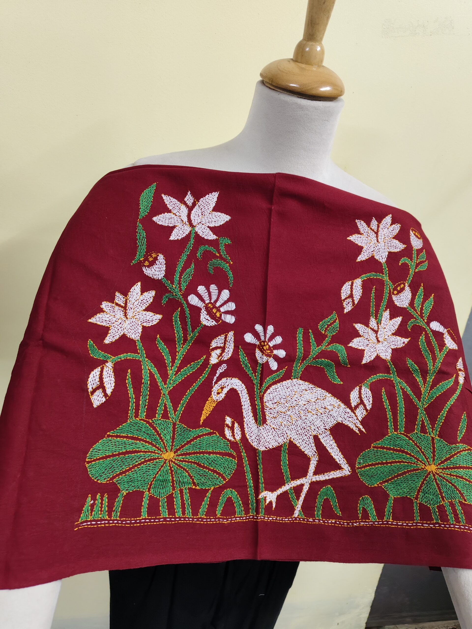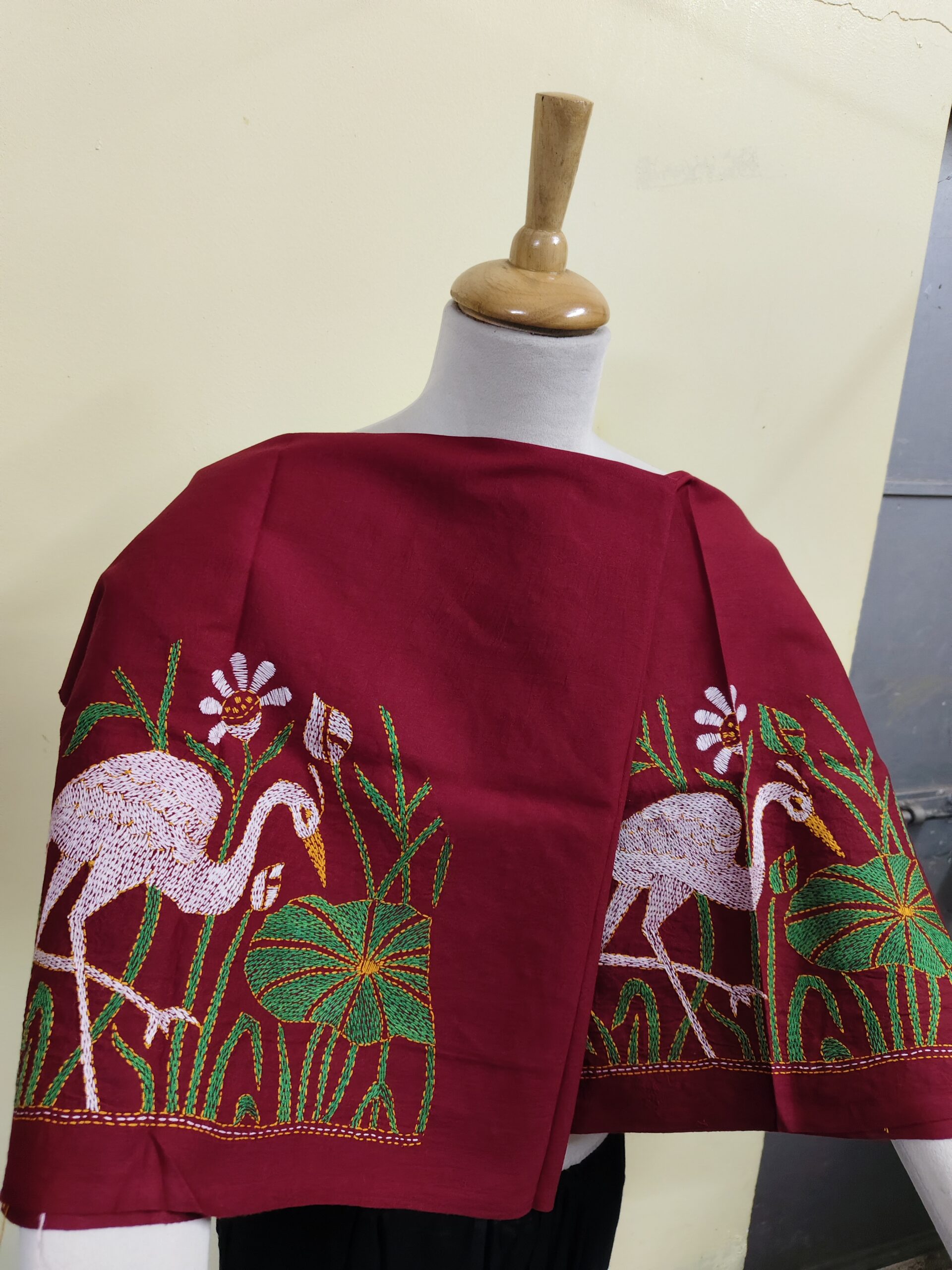 Stunning maroon cotton blouse material featuring a unique hand-embroidered heron, lotus flowers, and leaves. A premium artisanal piece for exclusive designer blouses.