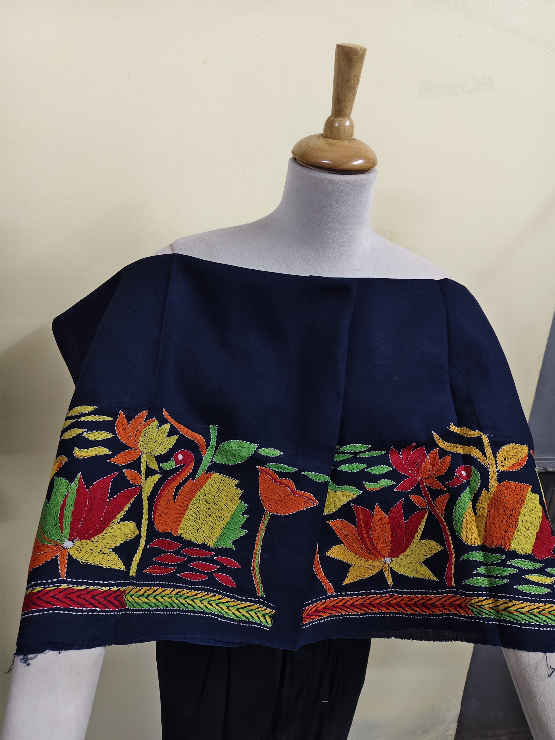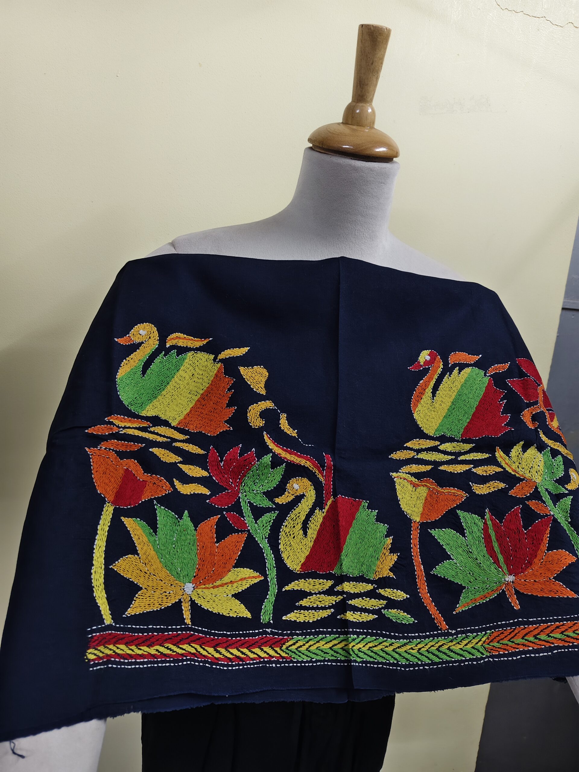 This premium cotton blouse material features beautiful hand-embroidered Kantha work with vibrant swan and lotus motifs. The fabric is soft, breathable, and perfect for custom blouse stitching. Each design is crafted by skilled artisans, making every piece unique. Ideal for pairing with sarees, suits, or mix-and-match ethnic wear.