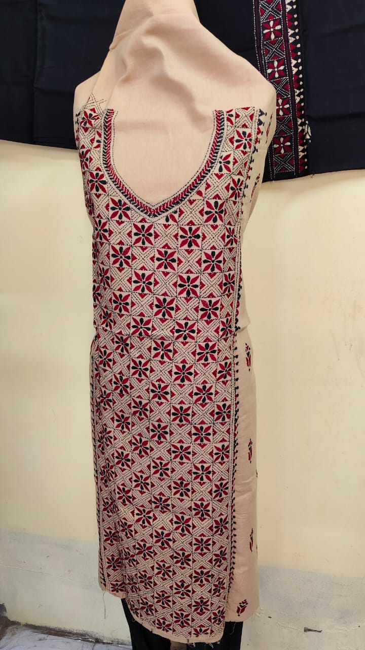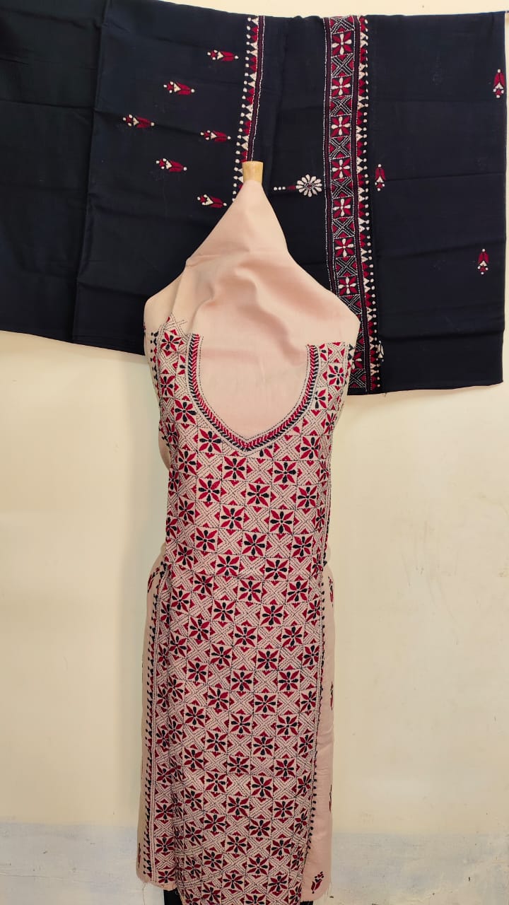 Handcrafted: Pure Cotton Kantha Stitch Salwar Suit Kurti Material 3-piece Set, Unstitched Top: 2.5 M, Bottom: 2.5M, Dupatta: 2M, Total length:- 7M, Width: 36 inches (Quantity 1 – Unstitched 3pc Set )