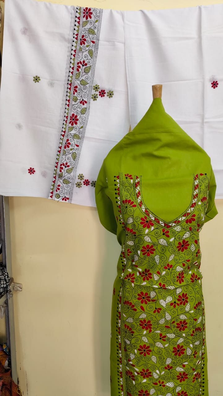 Premium Pure Cotton Kantha Stitch Salwar Suit Material (Mehendi Green) (Dupatta and Bottom Black color)