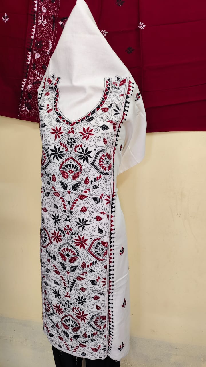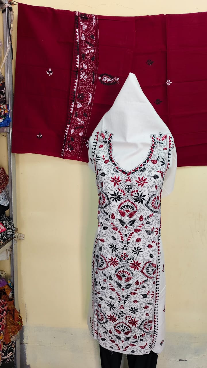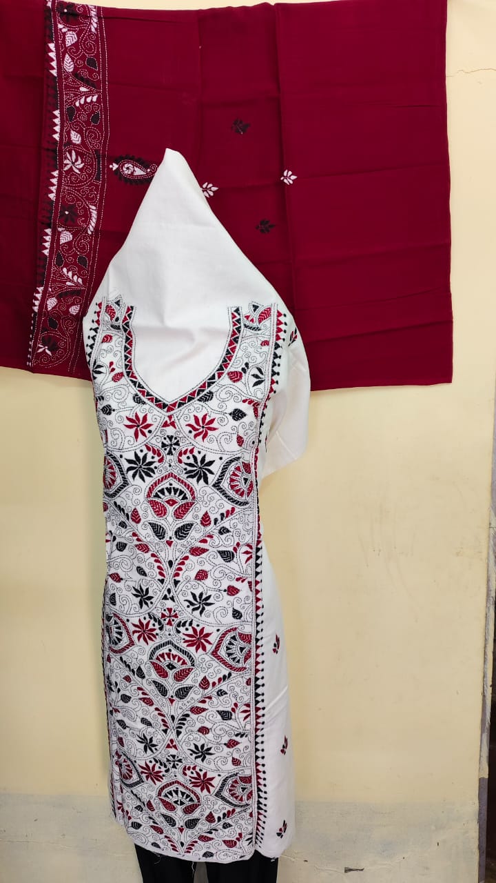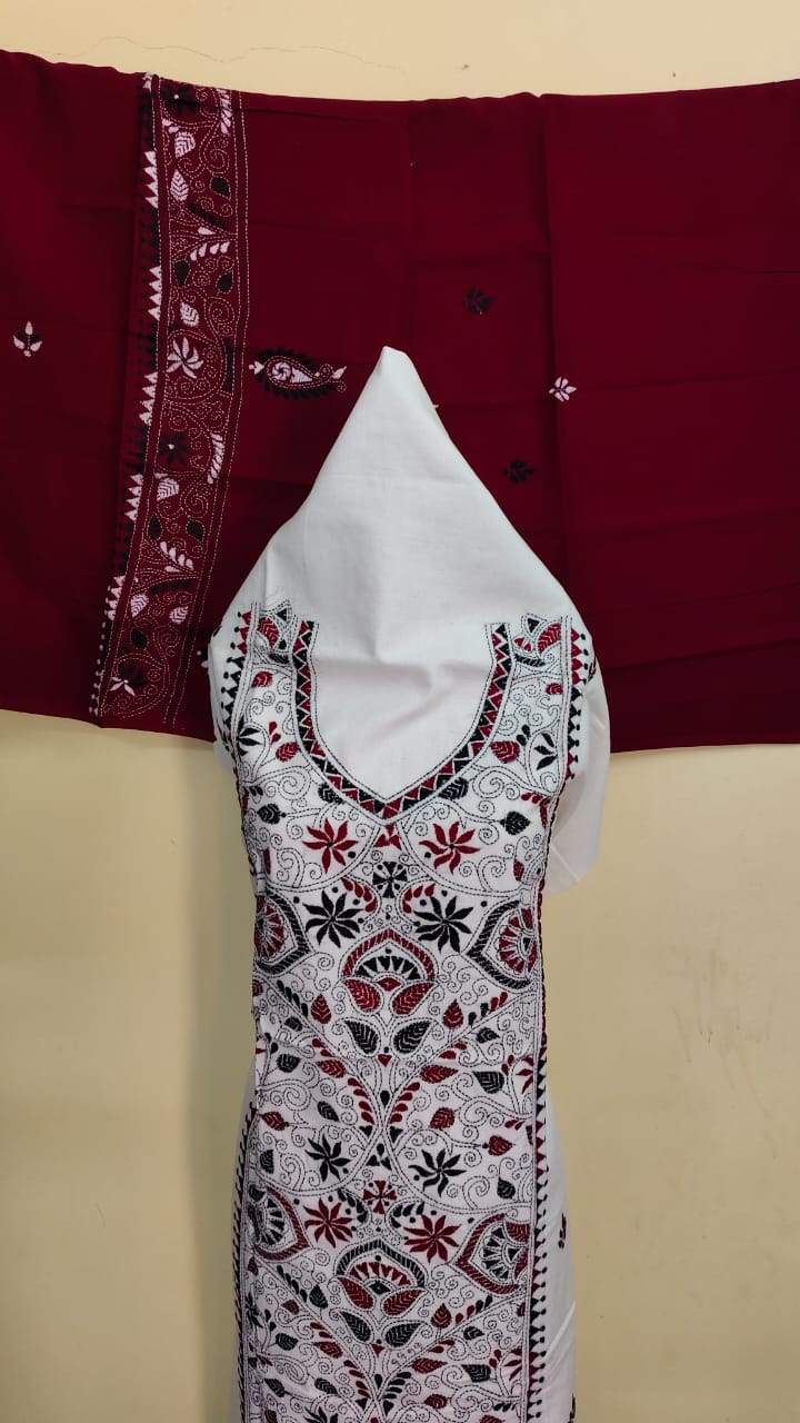 Premium Pure Cotton Kantha Stitch Salwar Suit Material (White, Maroon & Black)