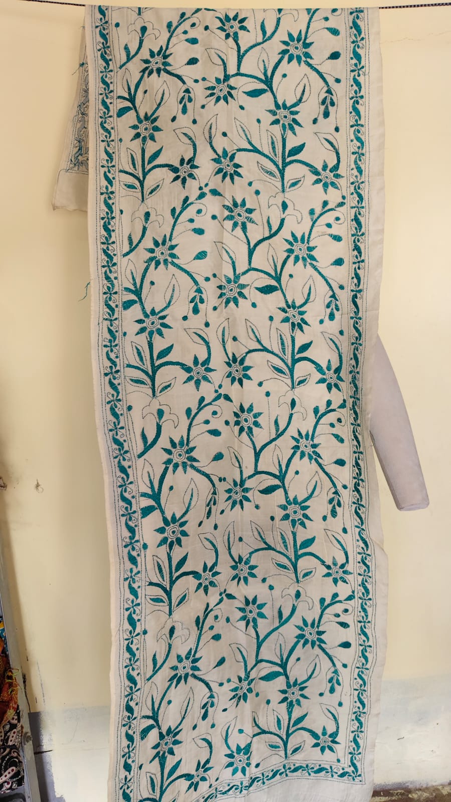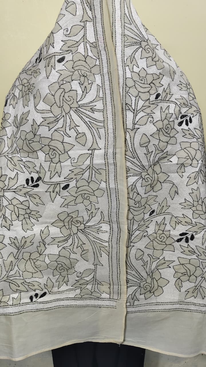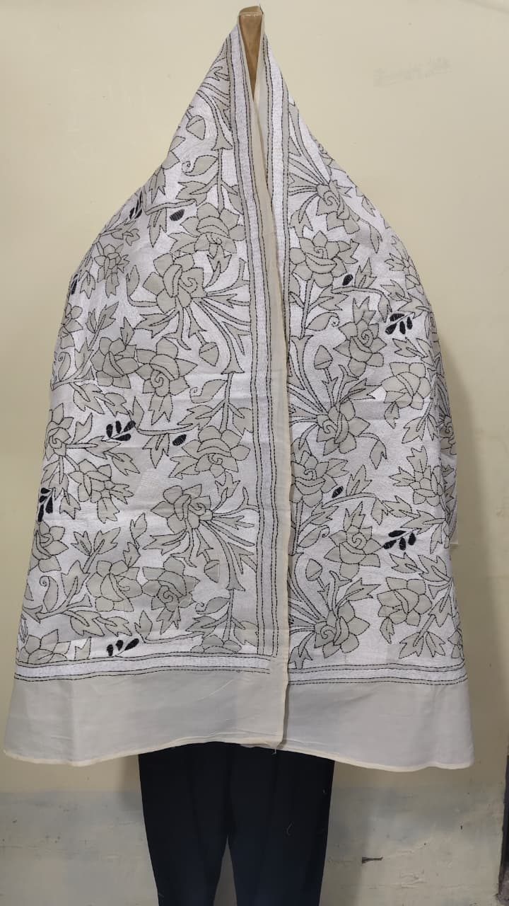 Premium Soft D Tussar Silk Handcrafted Stole â Elegant White Kantha Stitch Work