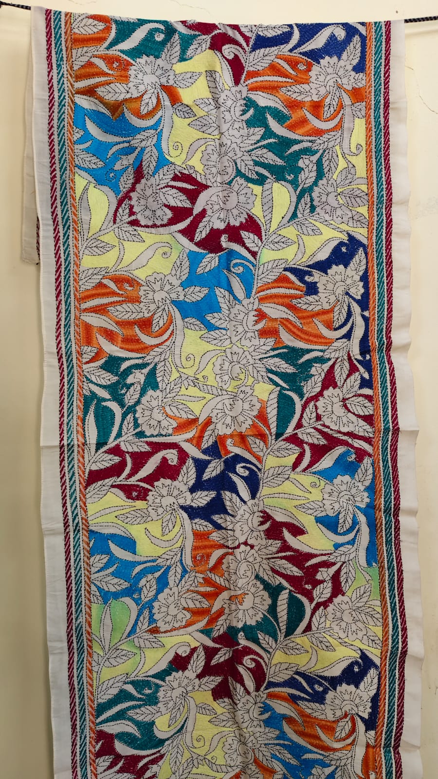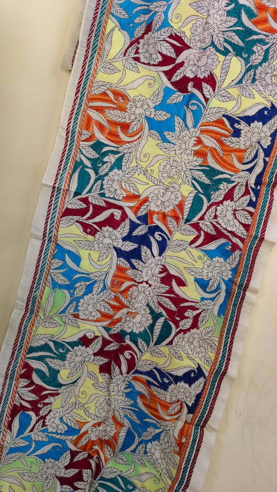 This is a premium soft de tussar silk stole, enriched with delicate hand kantha embroidery.