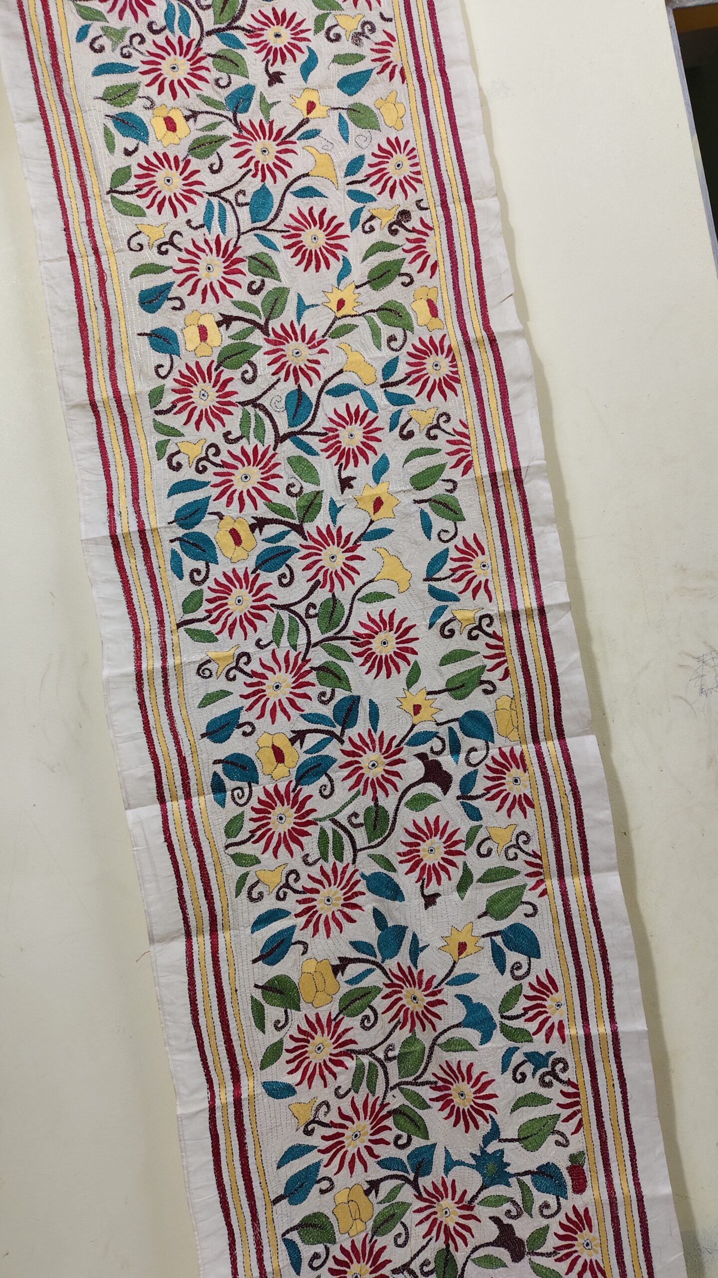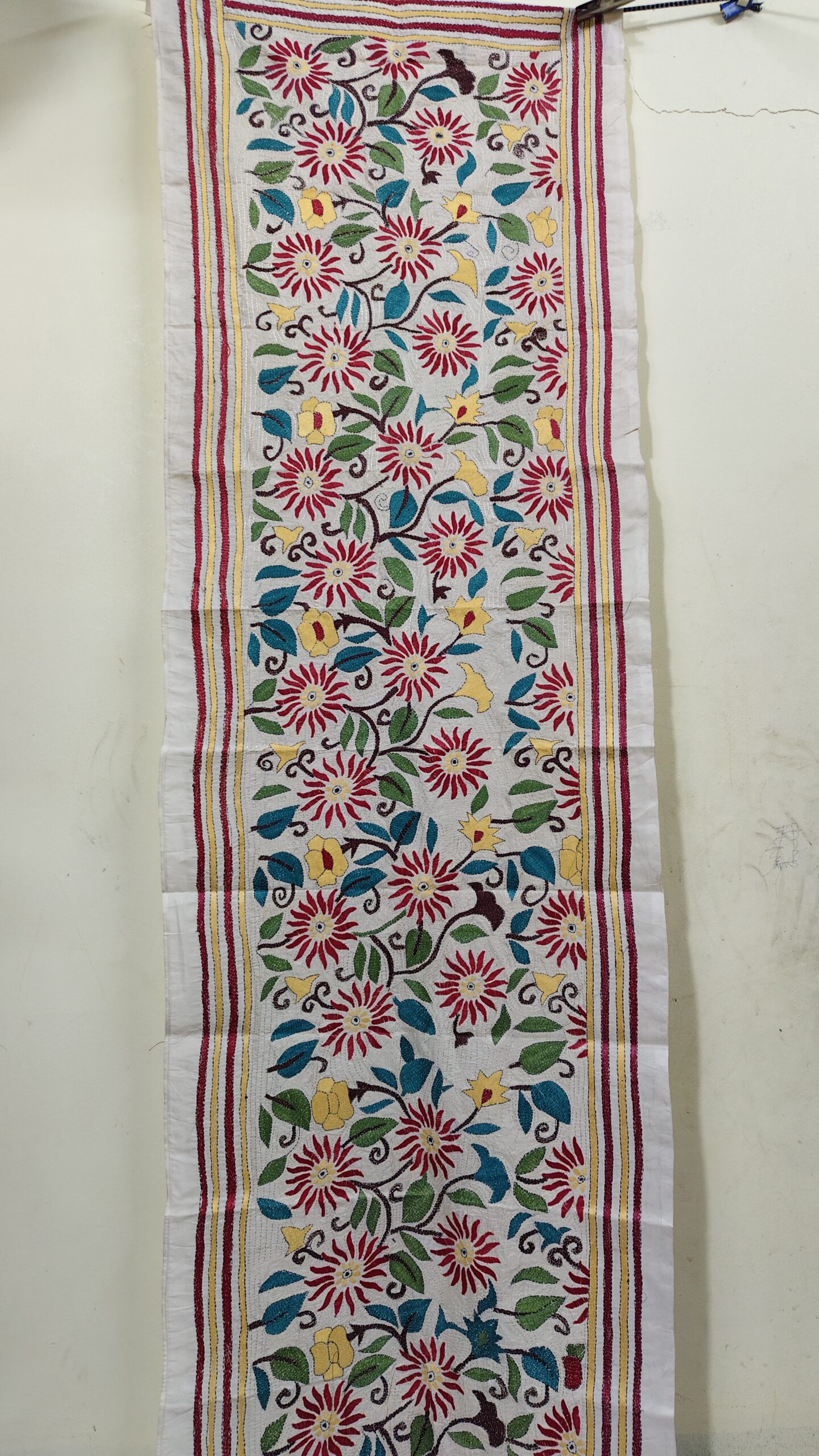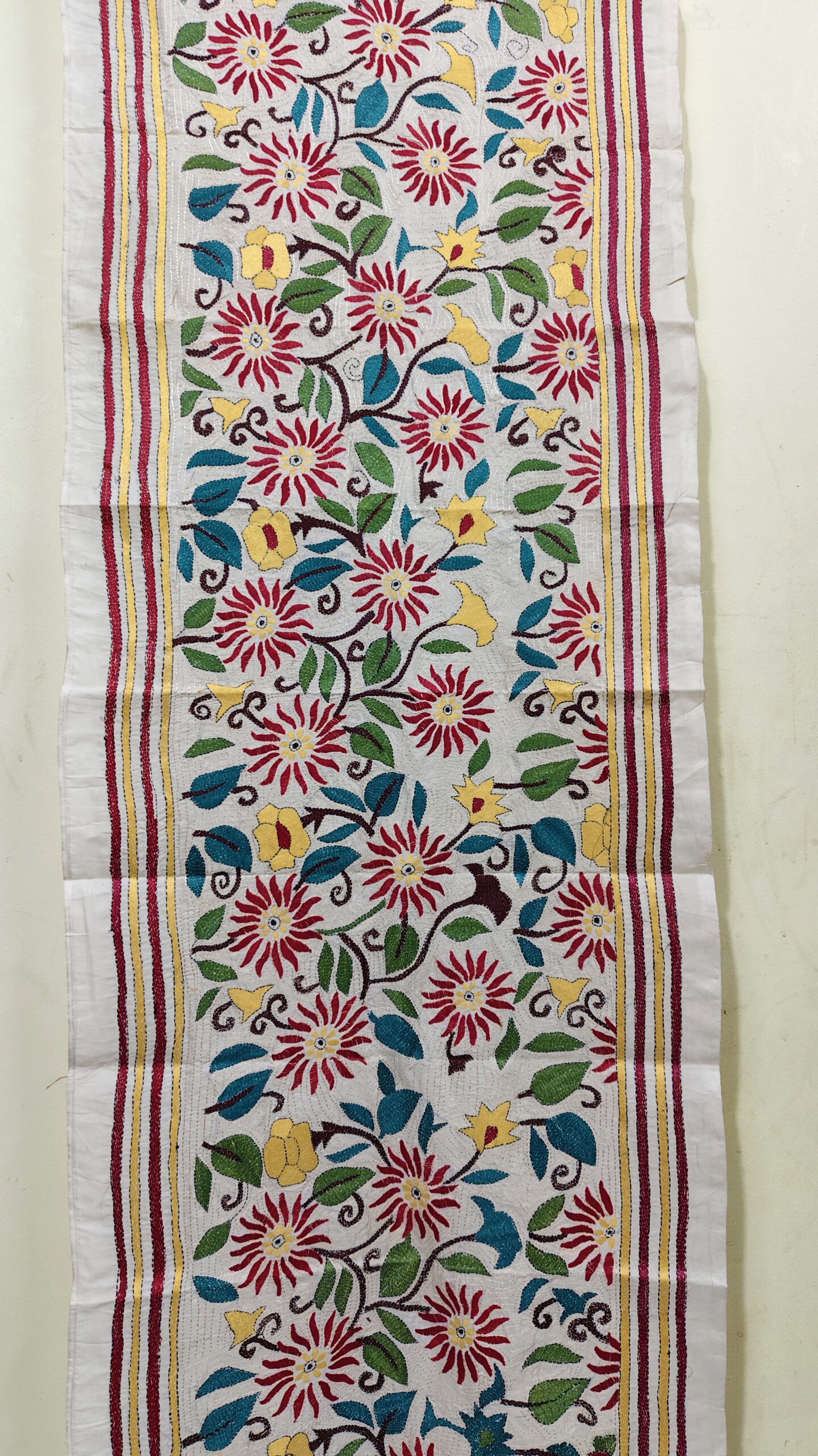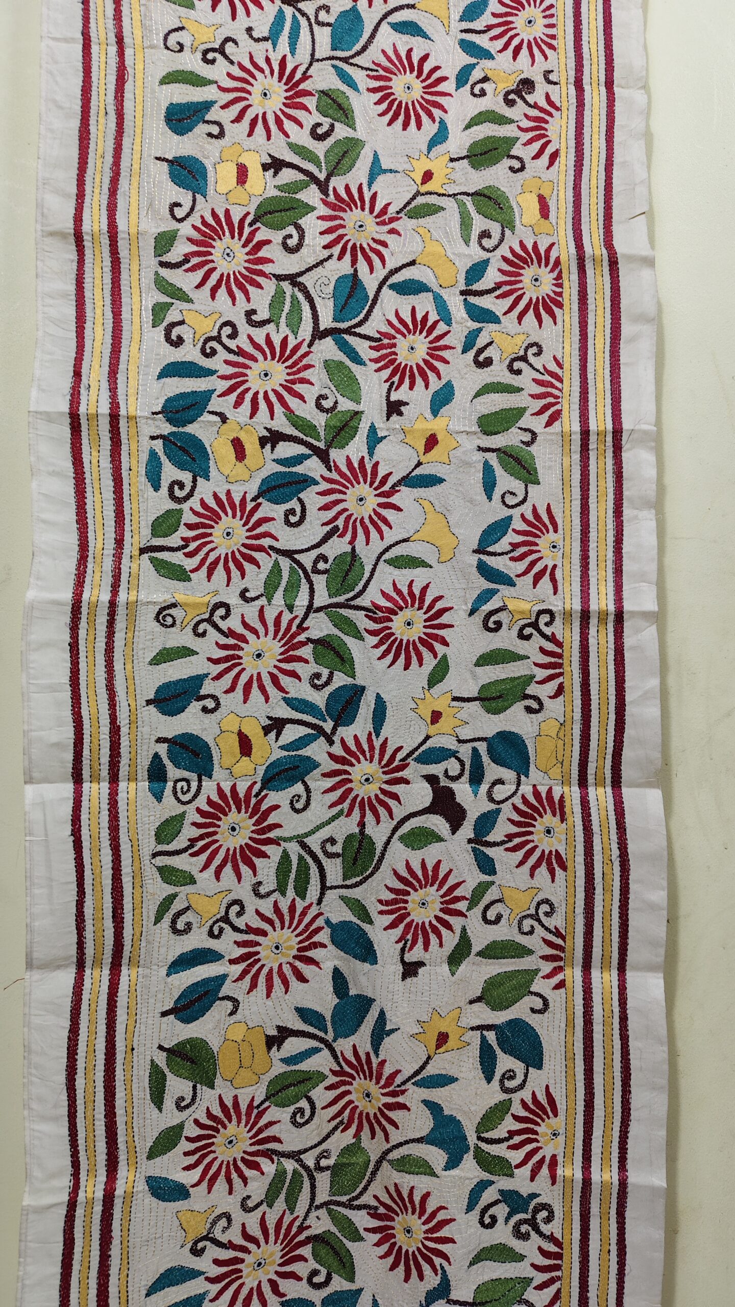 Premium Tussar Silk Kantha Stole with Multicolor Floral Embroidery
