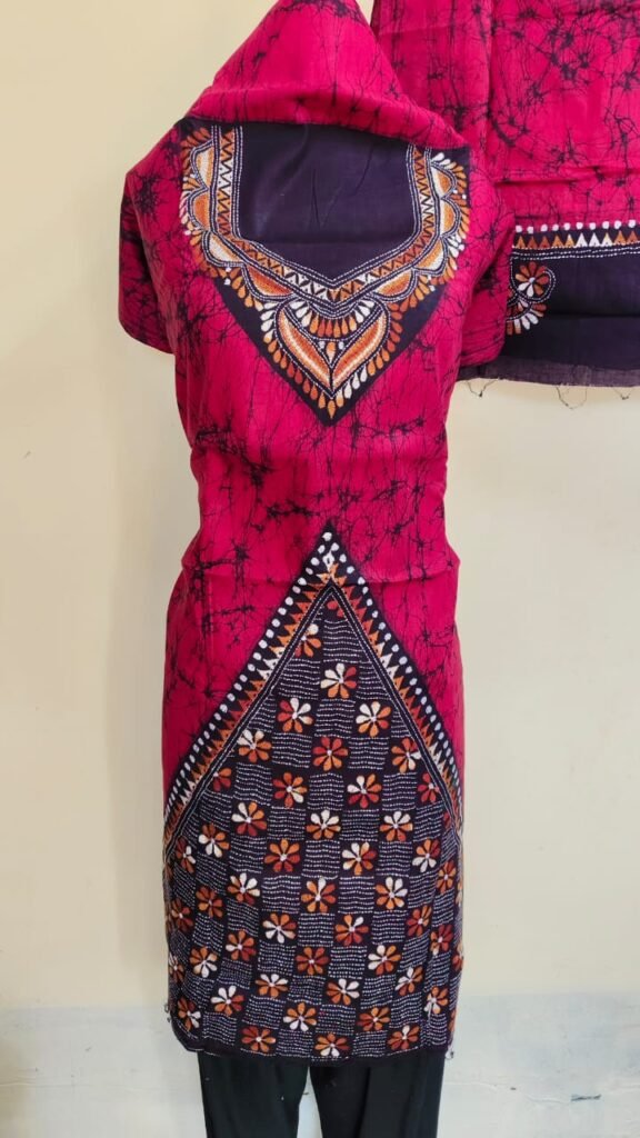 Kantha Stitch Batik 3-piece dress material set unstitched 7 meters made of 100% cotton. Top: 2.5 Meters, Bottom: 2.5M, Dupatta: 2M, Total length:- 7M, Width: 36 inches (Net Quantity 1 piece set)