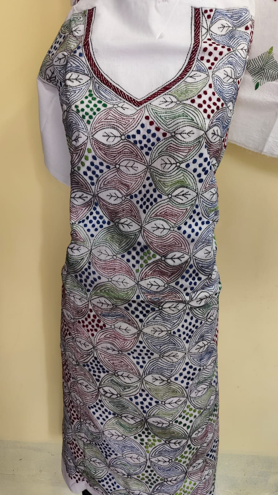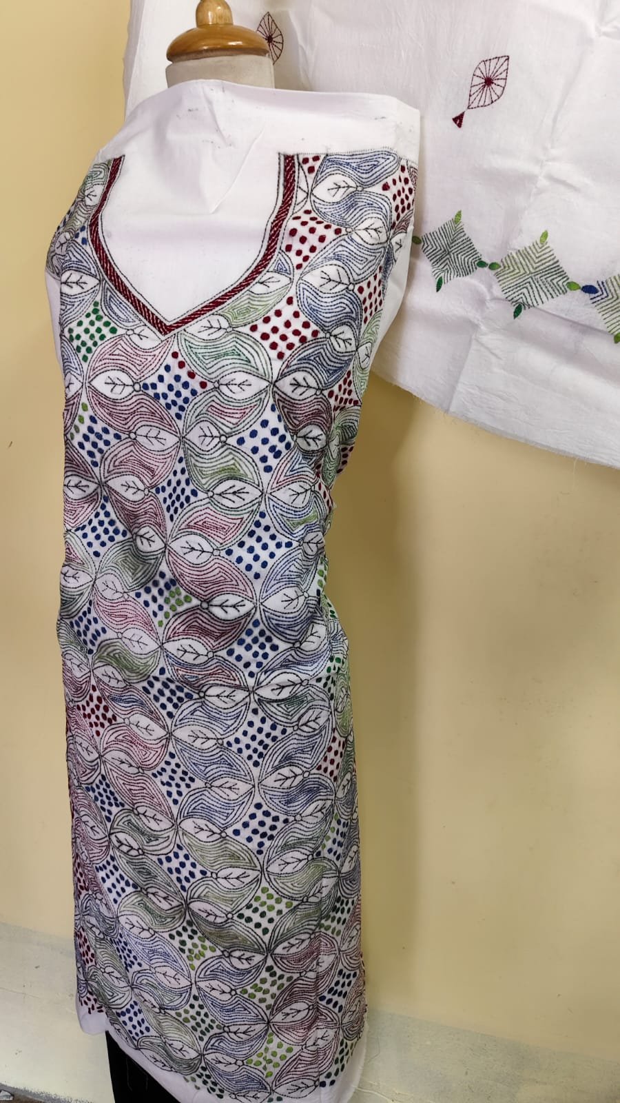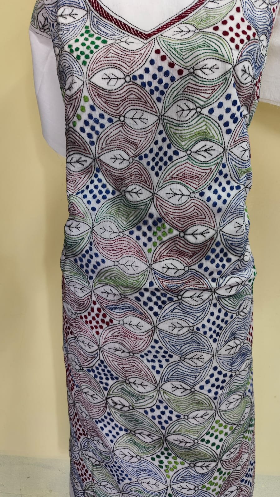 ✅Elegant and handcrafted Kantha Stitch Salwar Suit Material made from soft pure cotton fabric. The white base is beautifully adorned with multicolor hand embroidery in traditional leaf and dot motifs, giving it a classic Bengal touch. The neckline is intricately stitched, making it perfect for casual, festive, or semi-formal wear.