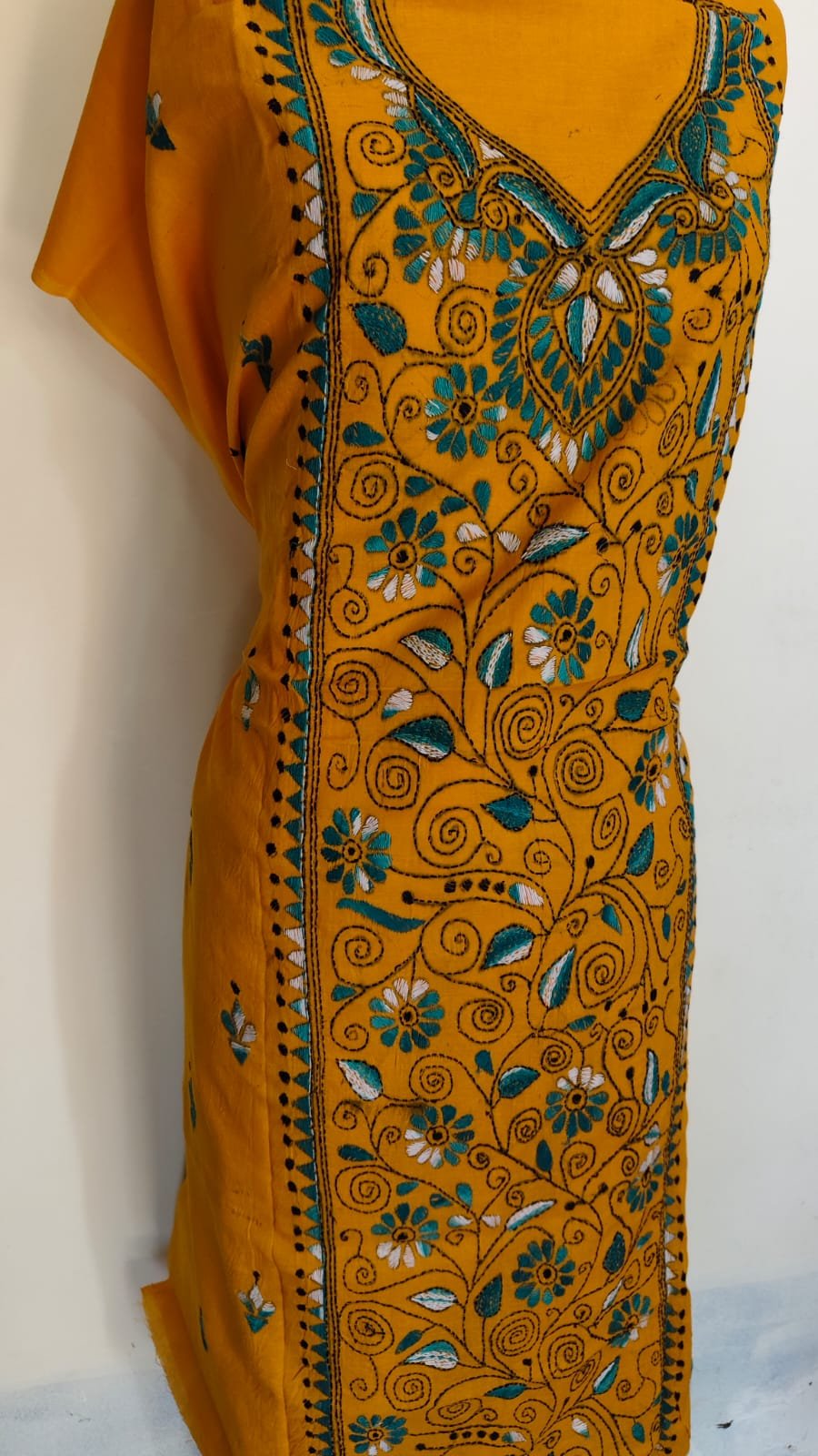 This elegant Unstitched Cotton Kantha Handwork Kurta Material showcases traditional Bengal craftsmanship. Made from soft pure cotton, the fabric features intricate hand embroidery using multicolor threads in floral and geometric motifs. Ideal for stitching into kurtas, tops, or ethnic wear, this piece reflects authentic handmade artistry with a comfortable and breathable feel.