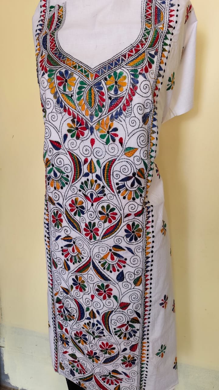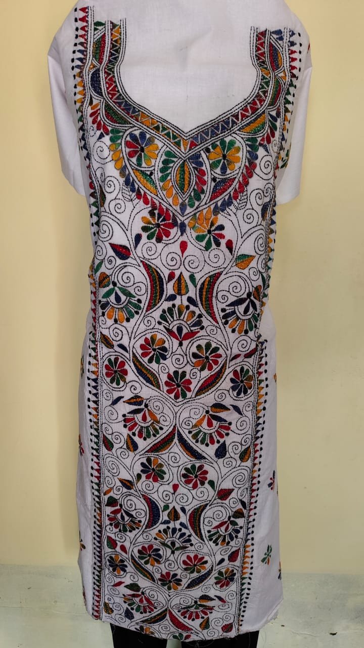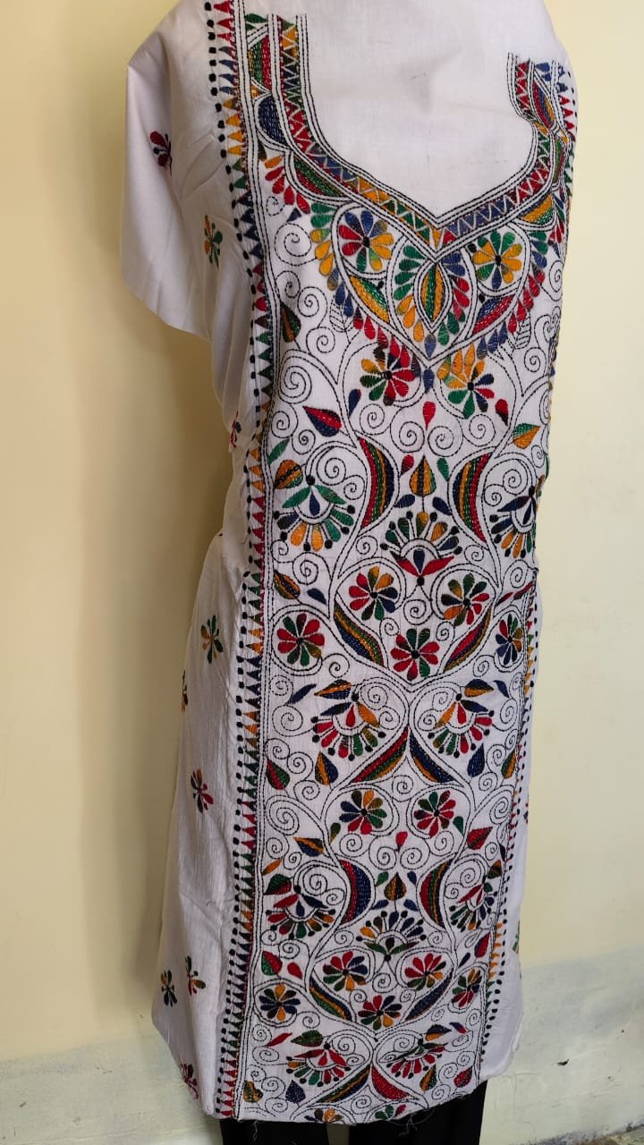 Pure Cotton White Kantha Long Kurti Material – Multicolor Floral