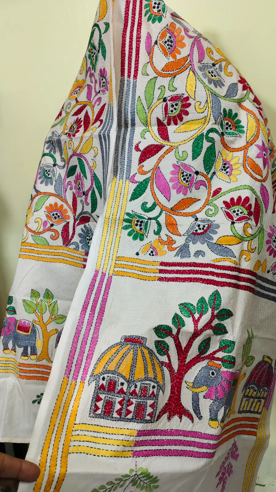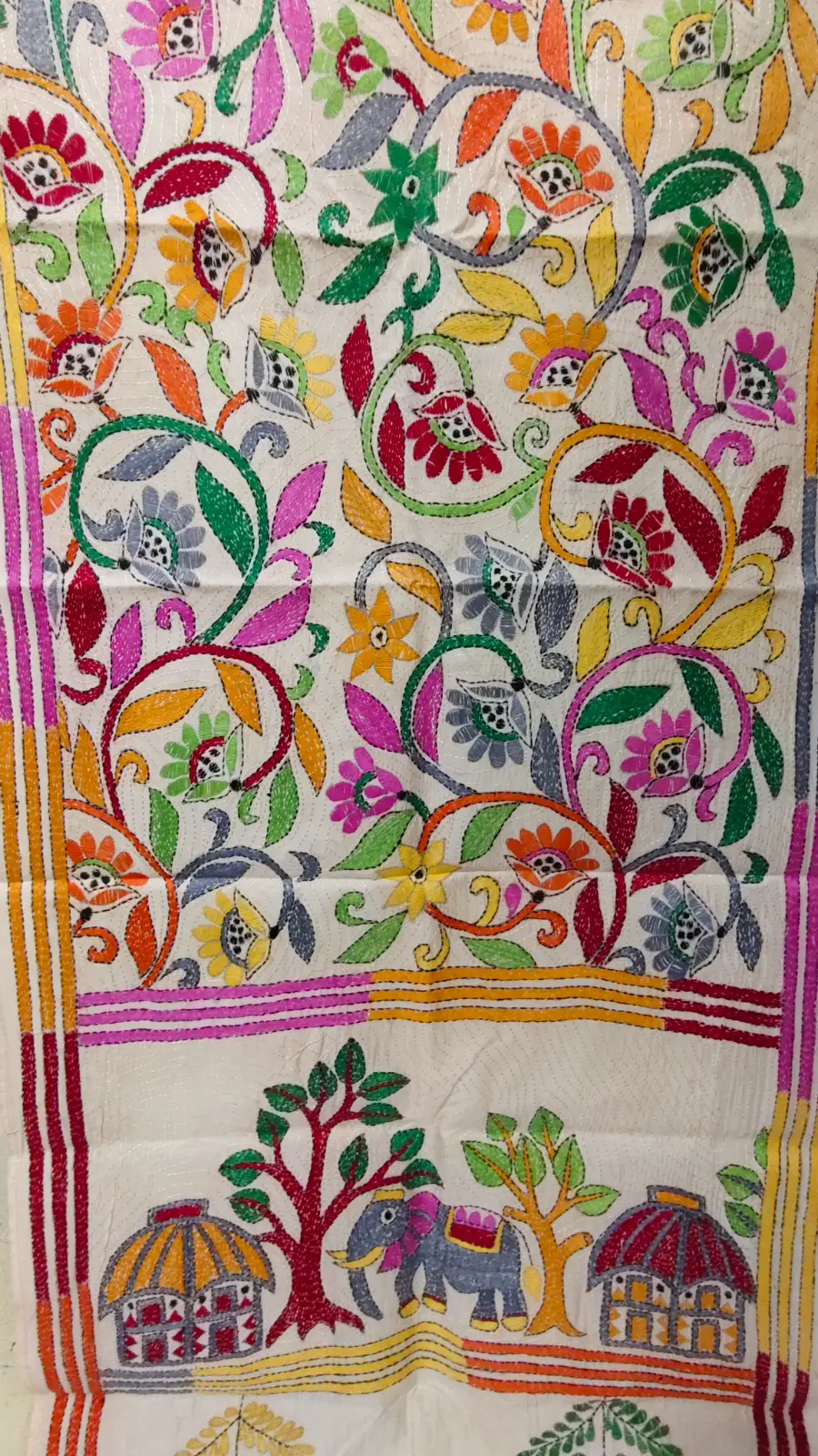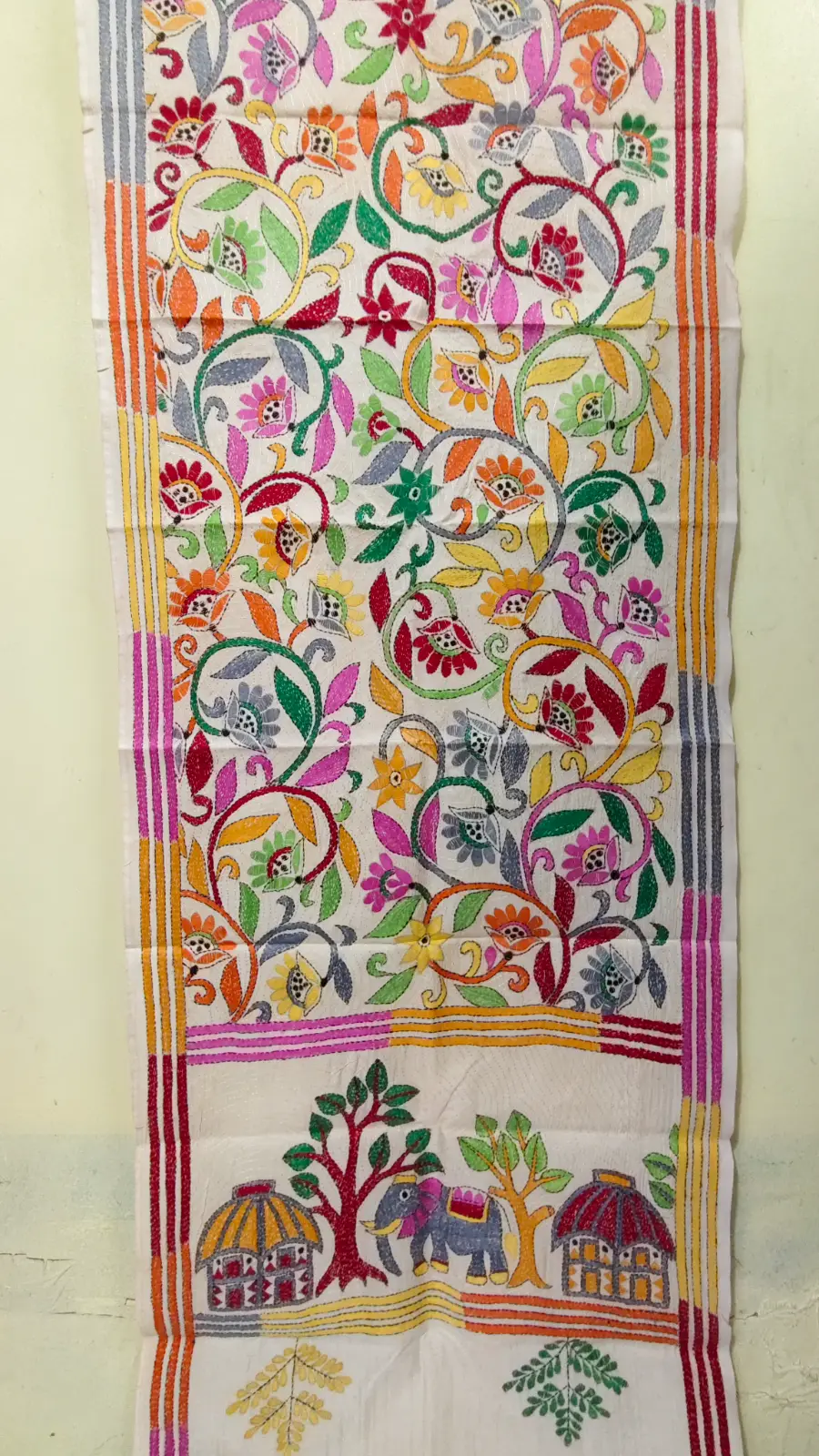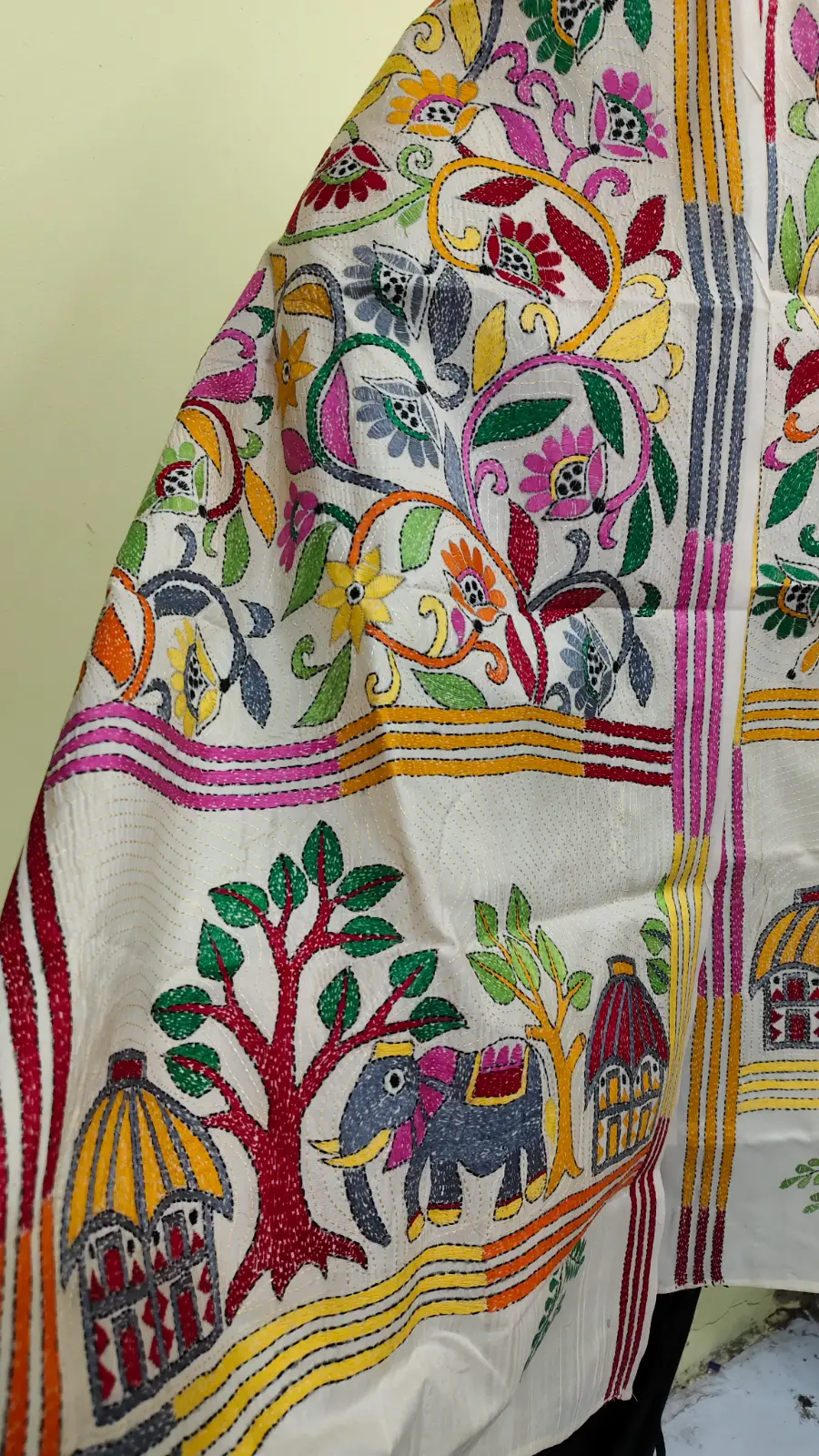 This pure Tussar silk stole is adorned with intricate Bengal Kantha hand embroidery, celebrating traditional folk artistry. The soft cream base is beautifully embellished with vibrant multicolor floral vines on the upper panel, while the lower border features charming village-inspired motifs with elephants, trees, and huts. Detailed striped accents along the borders enhance its artistic appeal. Lightweight and breathable, it drapes gracefully and adds a distinctive ethnic touch to any outfit—perfect for festive gatherings and cultural occasions. Each piece is artisan-crafted, making every stole unique in its stitch work and storytelling design.