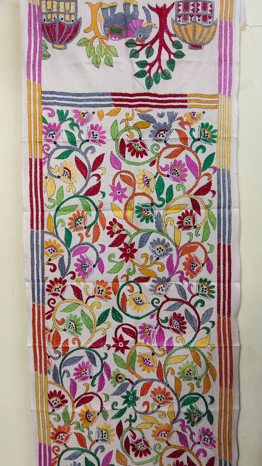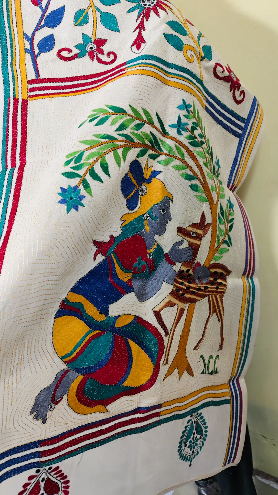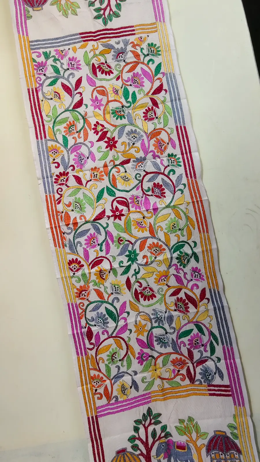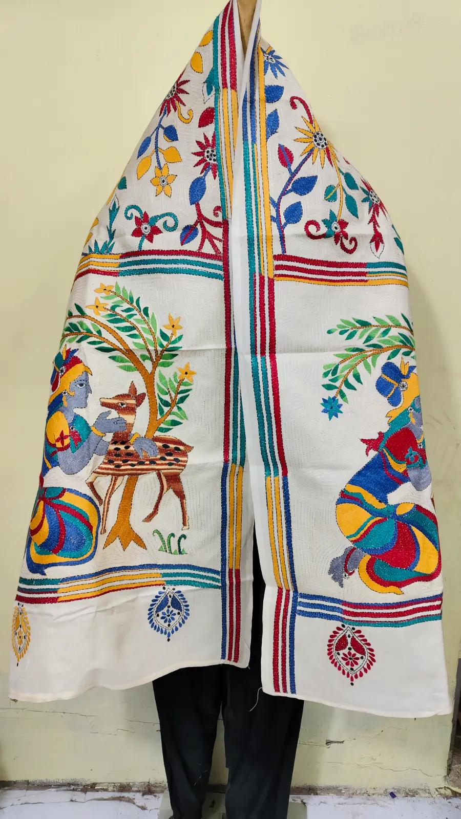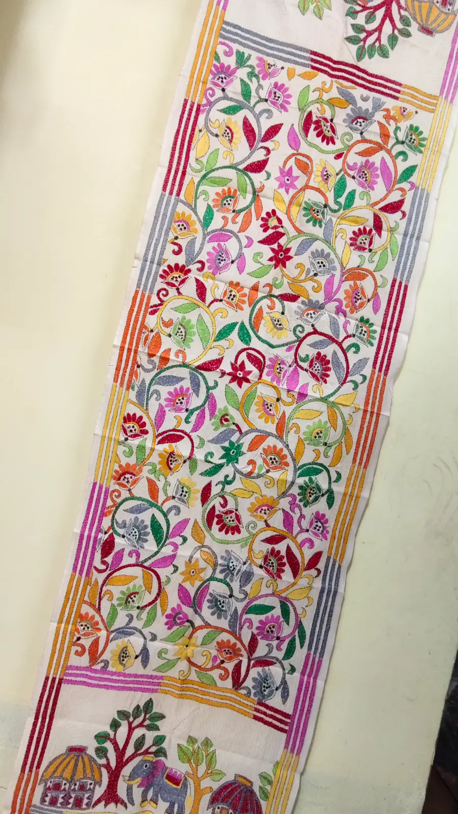 This pure Tussar silk stole is adorned with intricate Bengal Kantha hand embroidery, celebrating traditional folk artistry. The soft cream base is beautifully embellished with vibrant multicolor floral vines on the upper panel, while the lower border features charming village-inspired motifs with elephants, trees, and huts. Detailed striped accents along the borders enhance its artistic appeal. Lightweight and breathable, it drapes gracefully and adds a distinctive ethnic touch to any outfit—perfect for festive gatherings and cultural occasions. Each piece is artisan-crafted, making every stole unique in its stitch work and storytelling design.