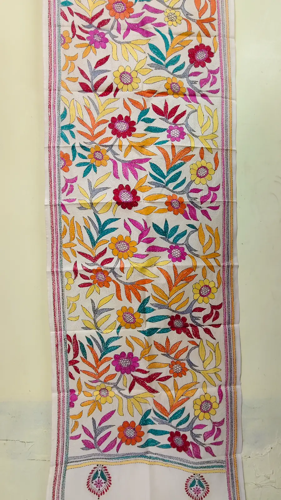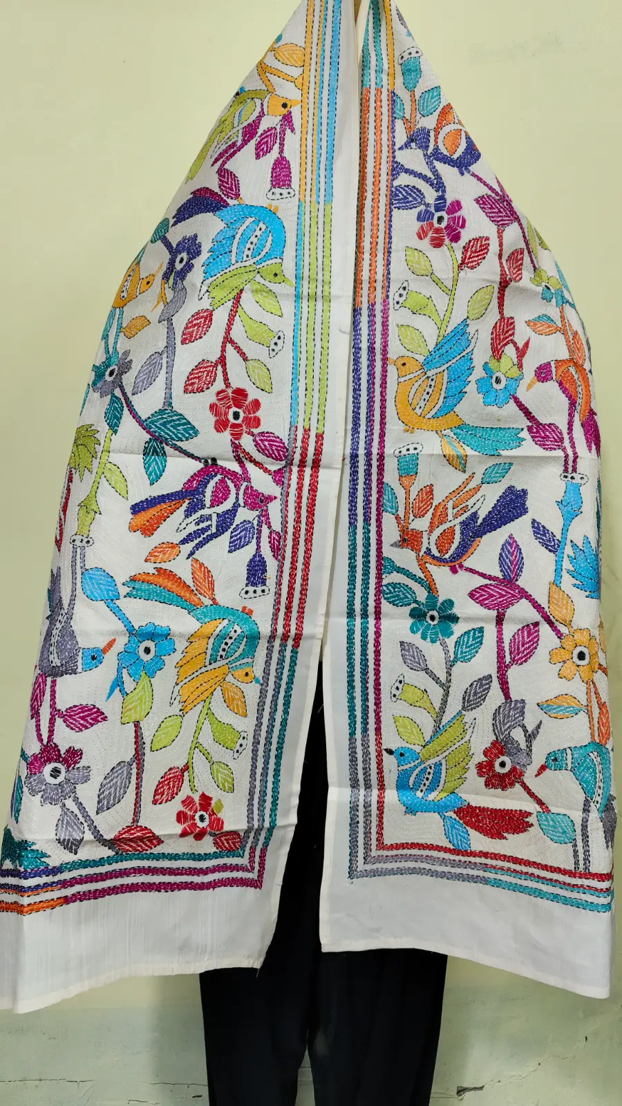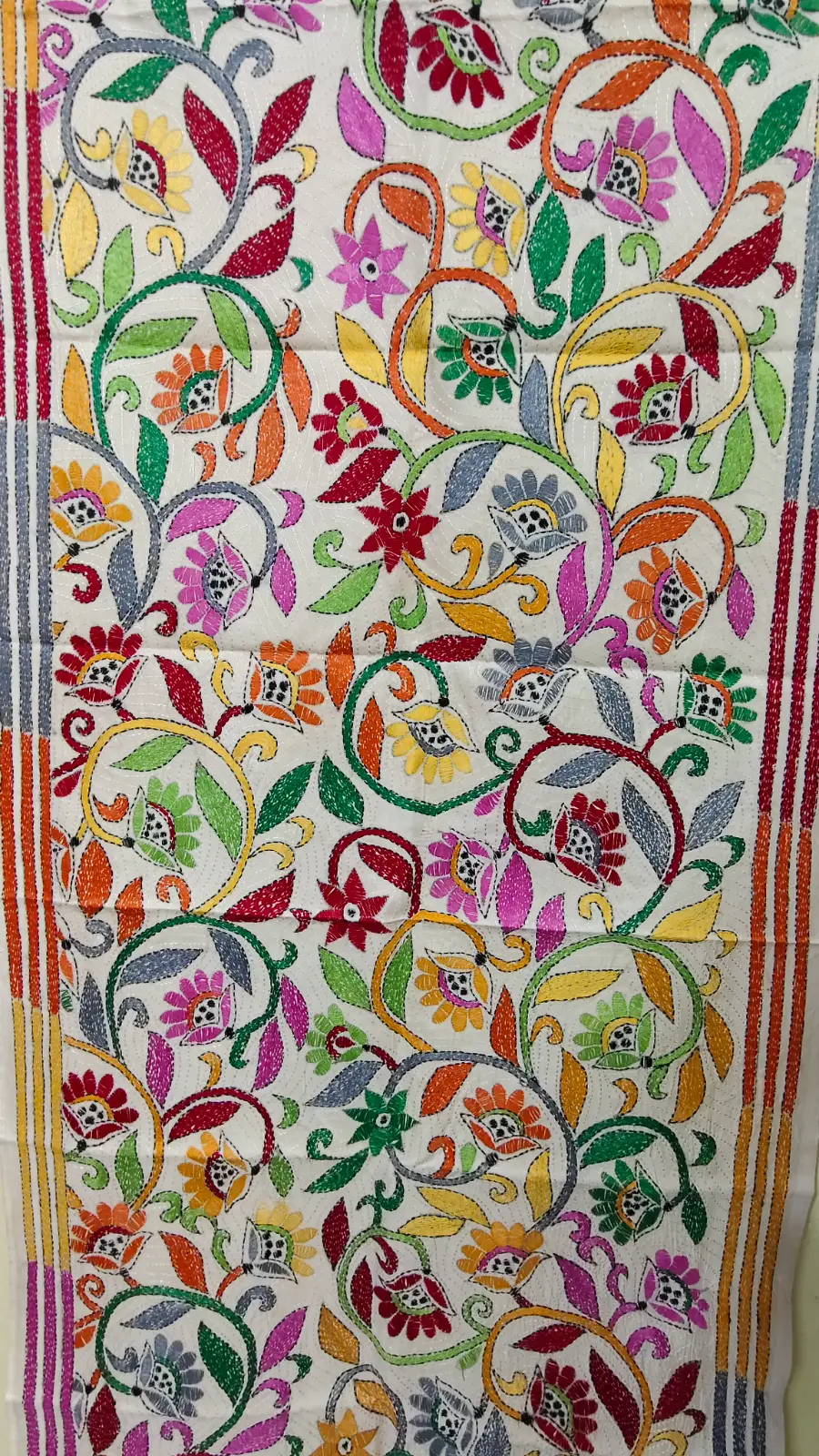 Pure D Tussar Silk Kantha Stole – Multicolor Folk Art & Floral Hand Embroidery on Cream Base