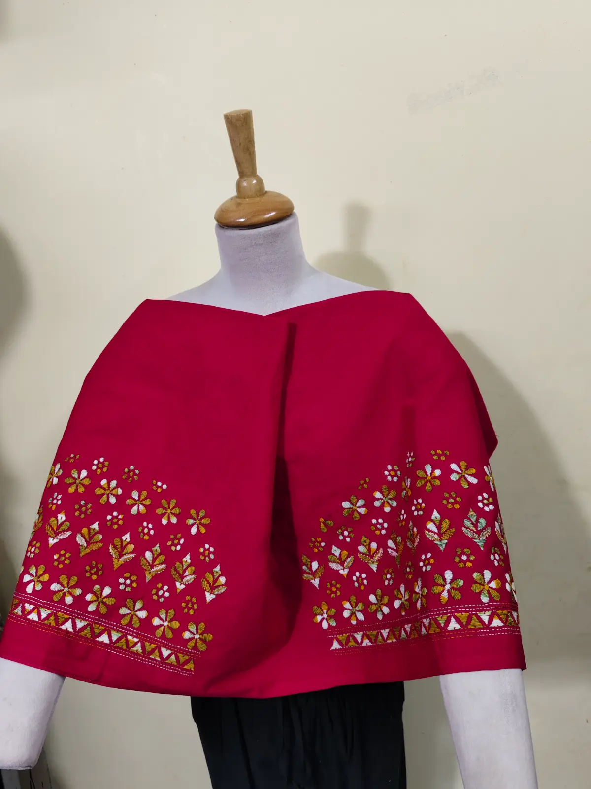 This vibrant Red blouse material is crafted from soft premium cotton and adorned with intricate hand-embroidered Kantha stitch motifs. The Green white mix color floral and leaf patterns create a rich and elegant texture, ideal for festive and traditional wear.