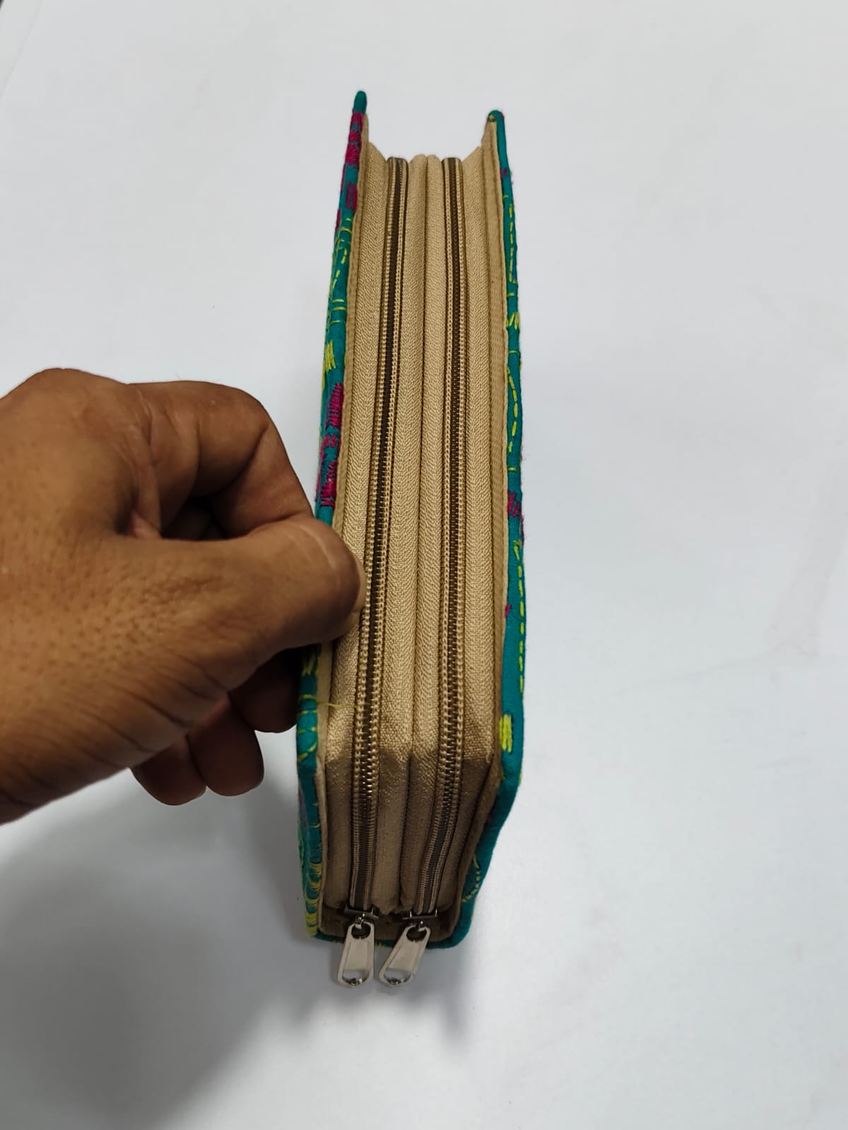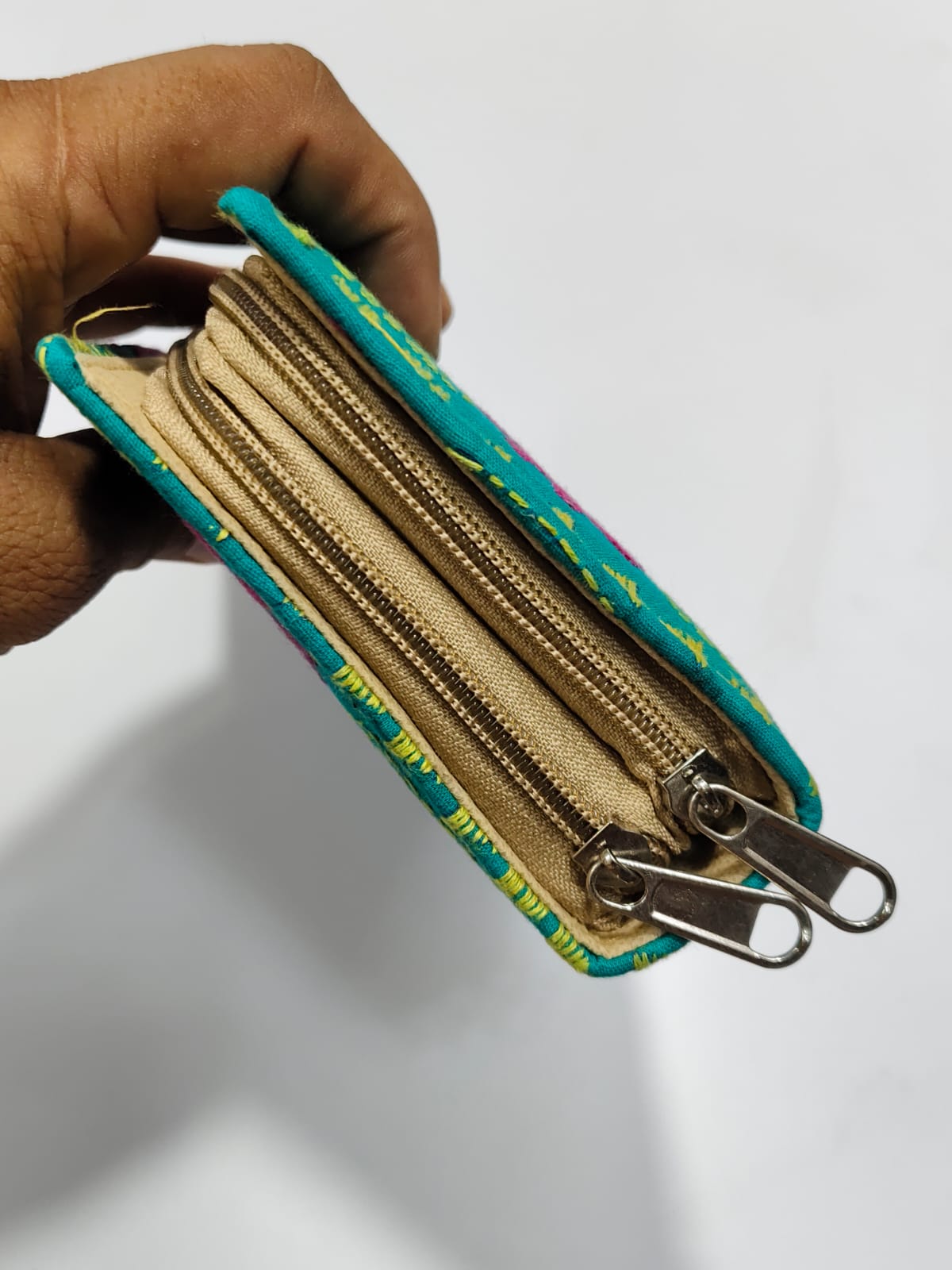 Sea Green Kantha Cotton Zip Wallet – Double Zipper Compartments