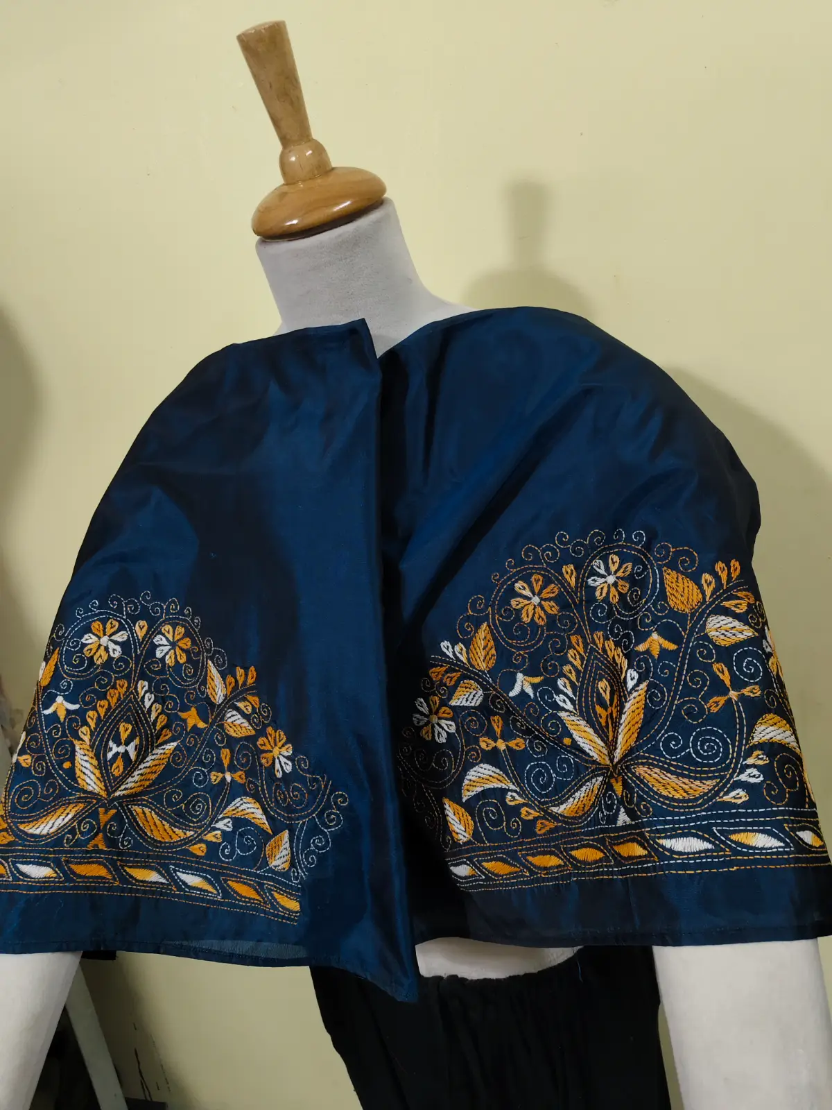 Add elegance to your ethnic wear with this exquisite silk Kantha stitch blouse piece, with colorful leaf motifs, made on silk fabric, the intricate thread work showcases traditional artistry with a modern flair. Perfect for pairing with a saree or a lehenga, this blouse piece will make your outfit stand out on weddings, festivals and special occasions.