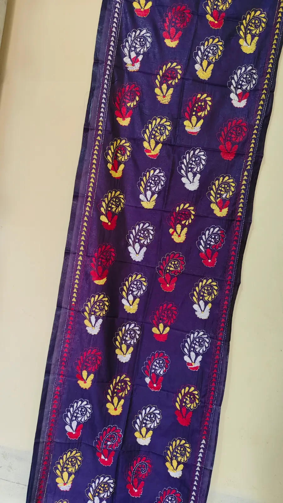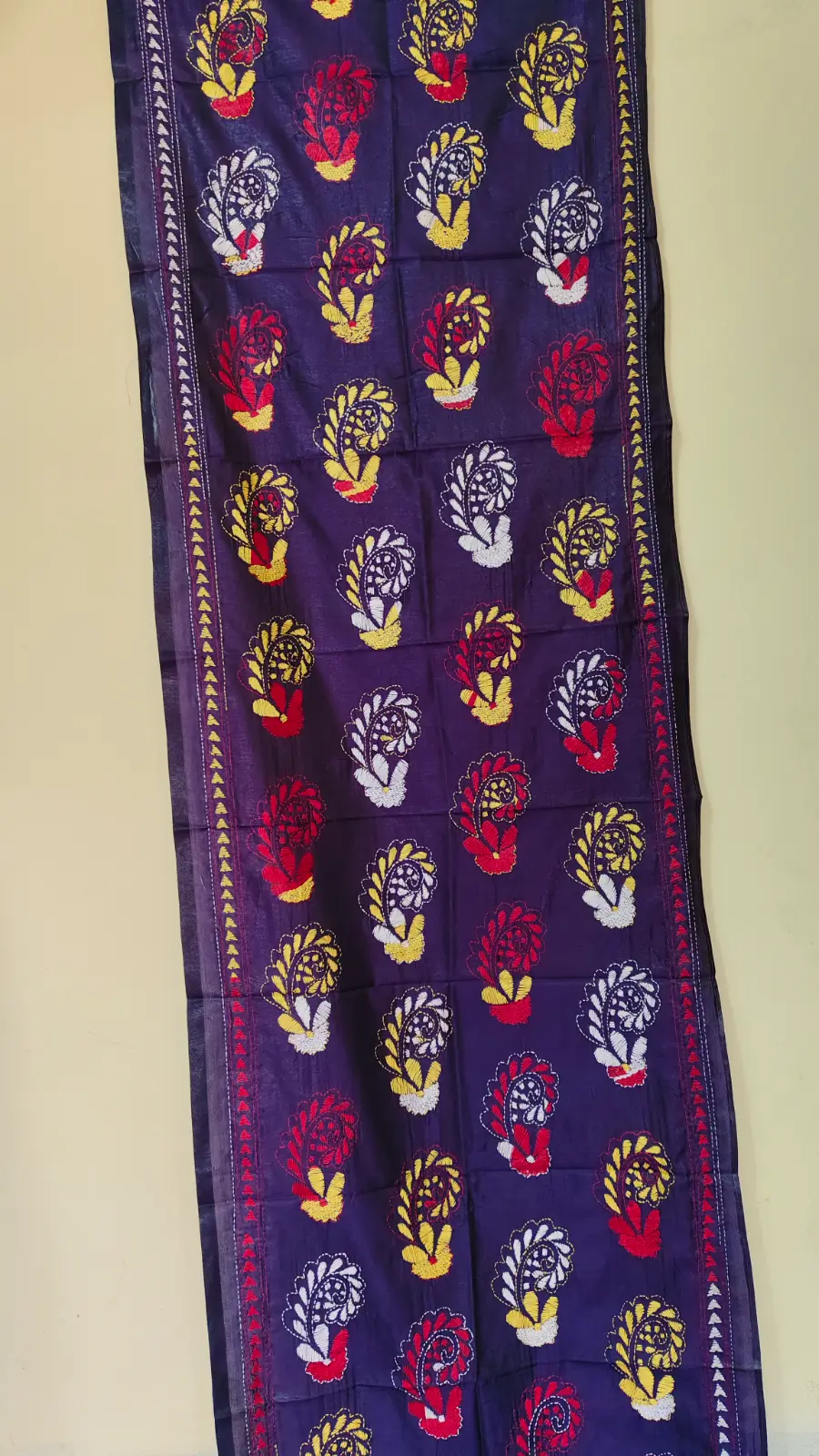 Vibrant and elegant, this Deep purple silk stole is adorned with multi-colored floral motifs set in a diamond grid layout. The intricate Kantha embroidery showcases red, red, yellow, and white, thread work, highlighted by multi-colored stripes on the border for a festive, handcrafted touch.