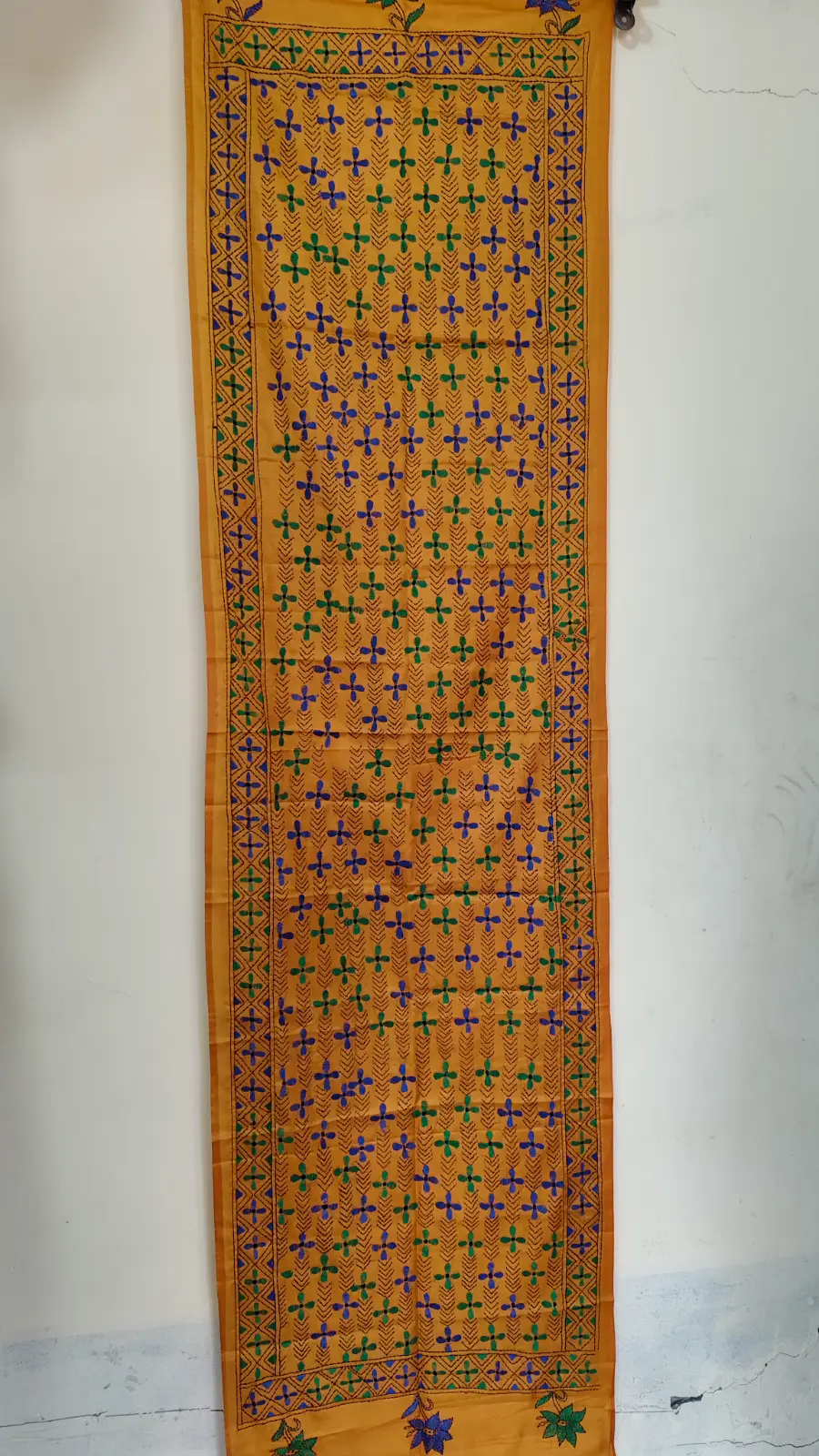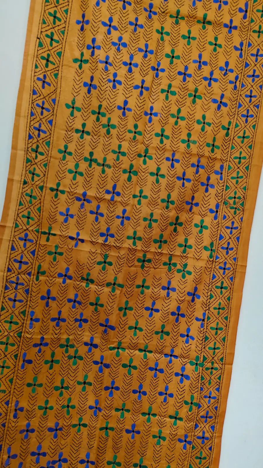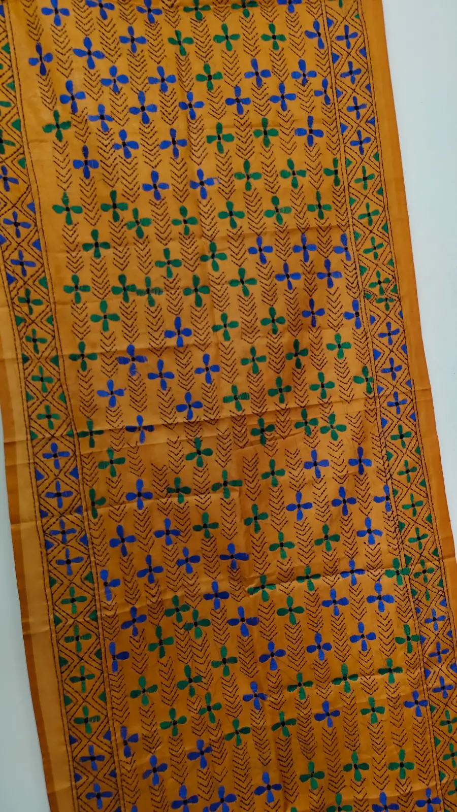 This stunning handmade stole features a wide border beautifully adorned, which enhances your style, made from premium Mustard yellow colored silk and adorned with traditional Kantha stitch embroidery. The elegant floral motifs are beautifully highlighted with Green, blue, creating a timeless look. Suitable for both casual and festive wear, this light and soft stole adds a touch of traditional charm to any outfit.