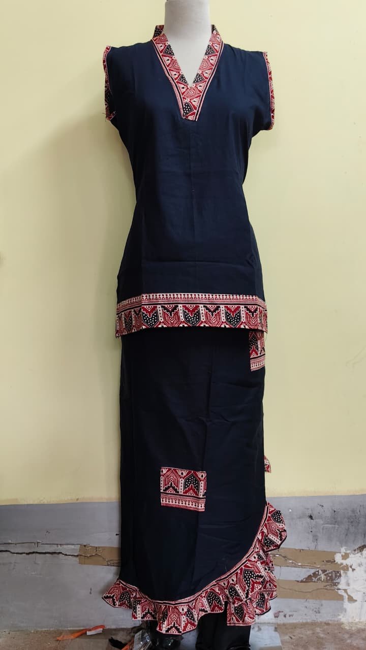 A perfect combination of style and comfort in this Sleeveless Top & Rapron Set. Navy blue color with red-white-black traditional print border design gives it a unique beauty.