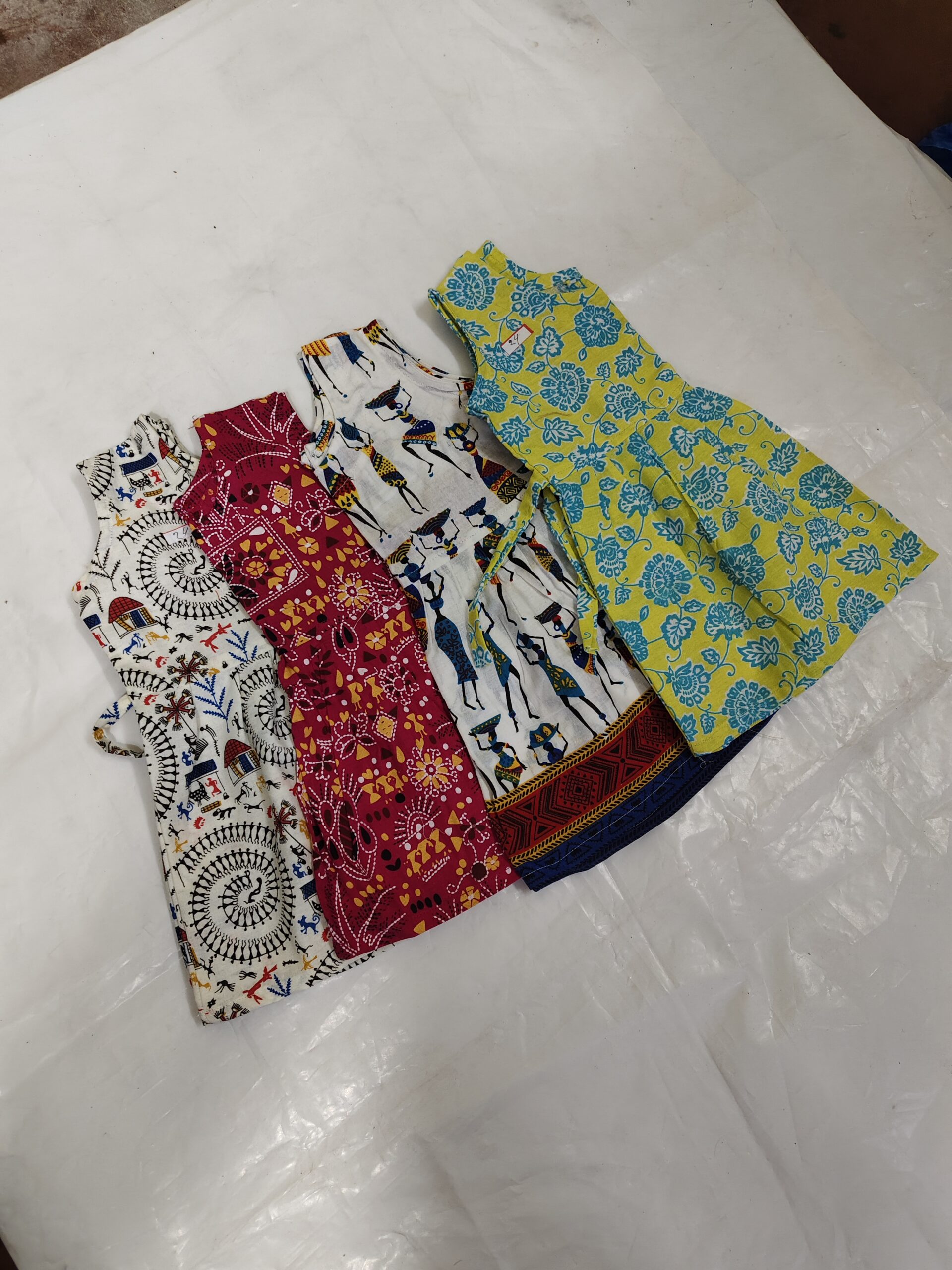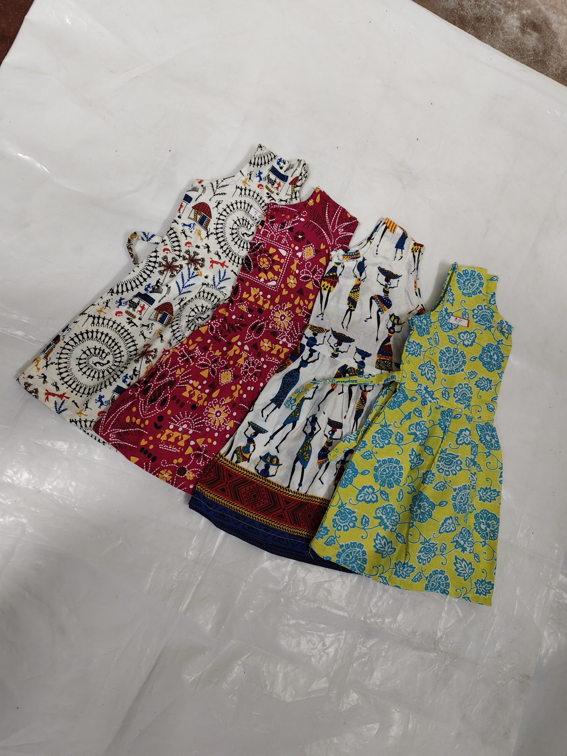 Made from soft and breathable cotton, this kids’ gown frock comes in beautiful ethnic and tribal-inspired prints that add a colourful, playful charm. The sleeveless design keeps children comfortable in all seasons, while the back-tie belt ensures an easy, adjustable fit. Each piece features vibrant motifs — from folk art patterns to village and animal prints — making it perfect for everyday wear, festive occasions, or gifting.
