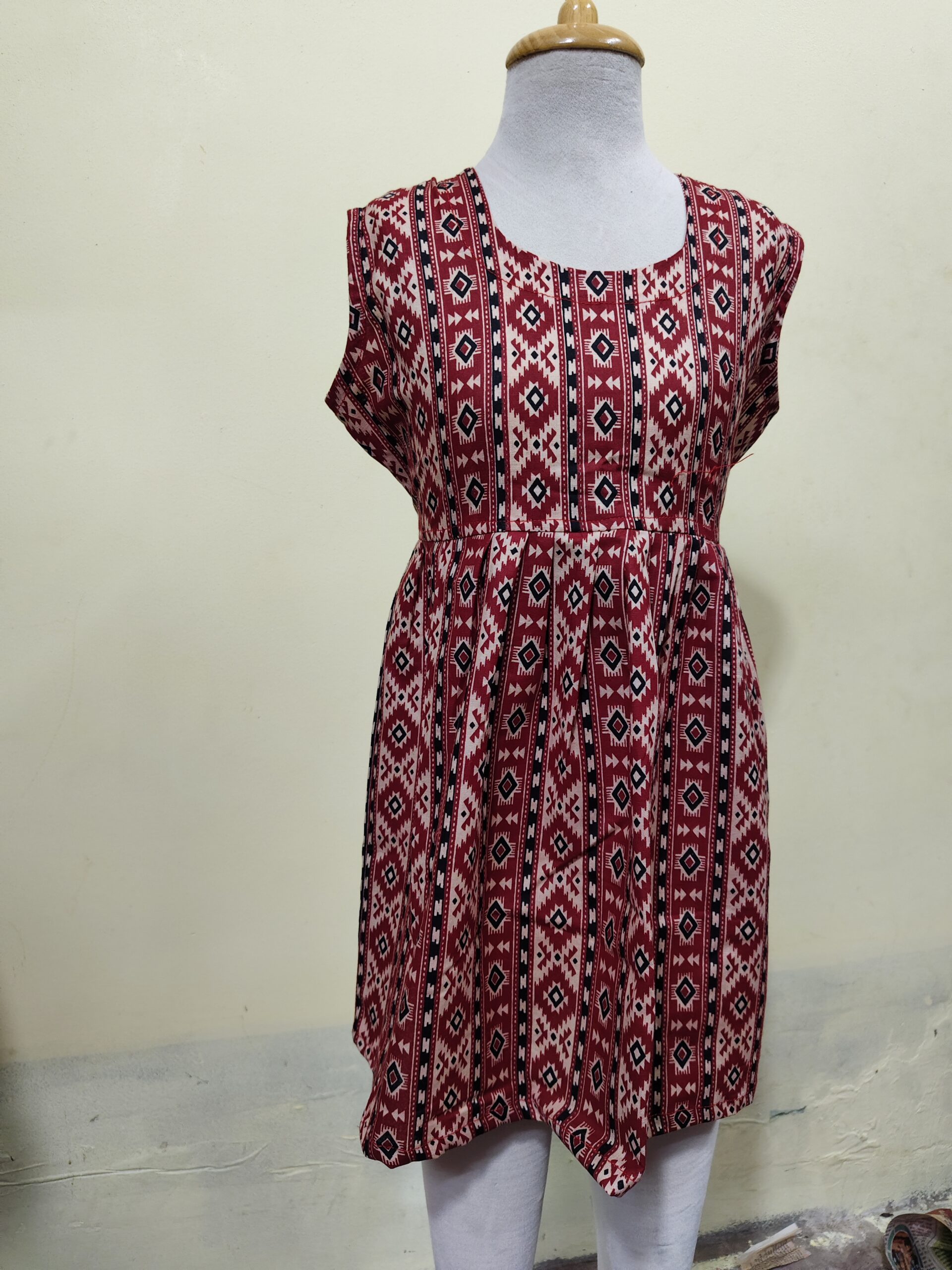Made from soft and breathable cotton, this kids’ gown frock offers all-day comfort for active little girls. The fabric features a beautiful red-and-black ethnic floral print that adds a stylish charm while keeping the look playful and age-appropriate. The sleeveless design and gently gathered waist provide an easy, relaxed fit that moves comfortably with the child.