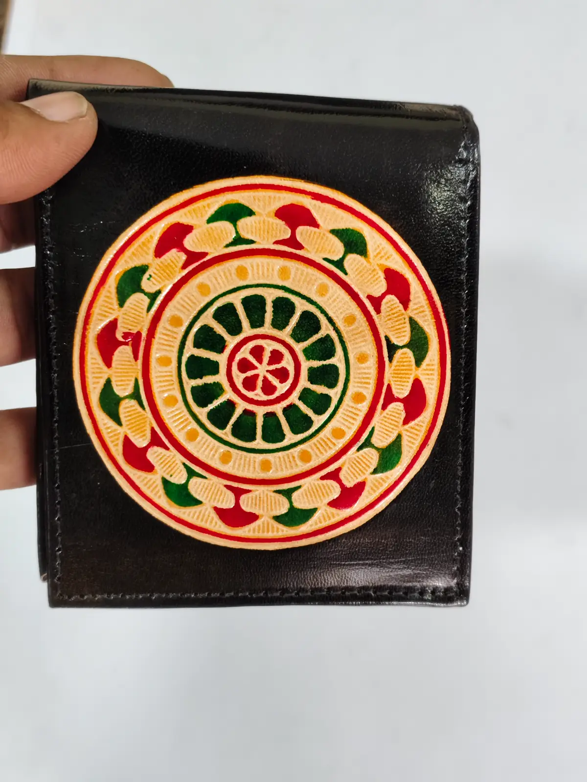 This elegant handcrafted leather wallet in classic black features a beautifully embossed circular design, blending tradition with modern style. Made from high-quality leather, it ensures durability and sophistication, making it a perfect everyday accessory.
