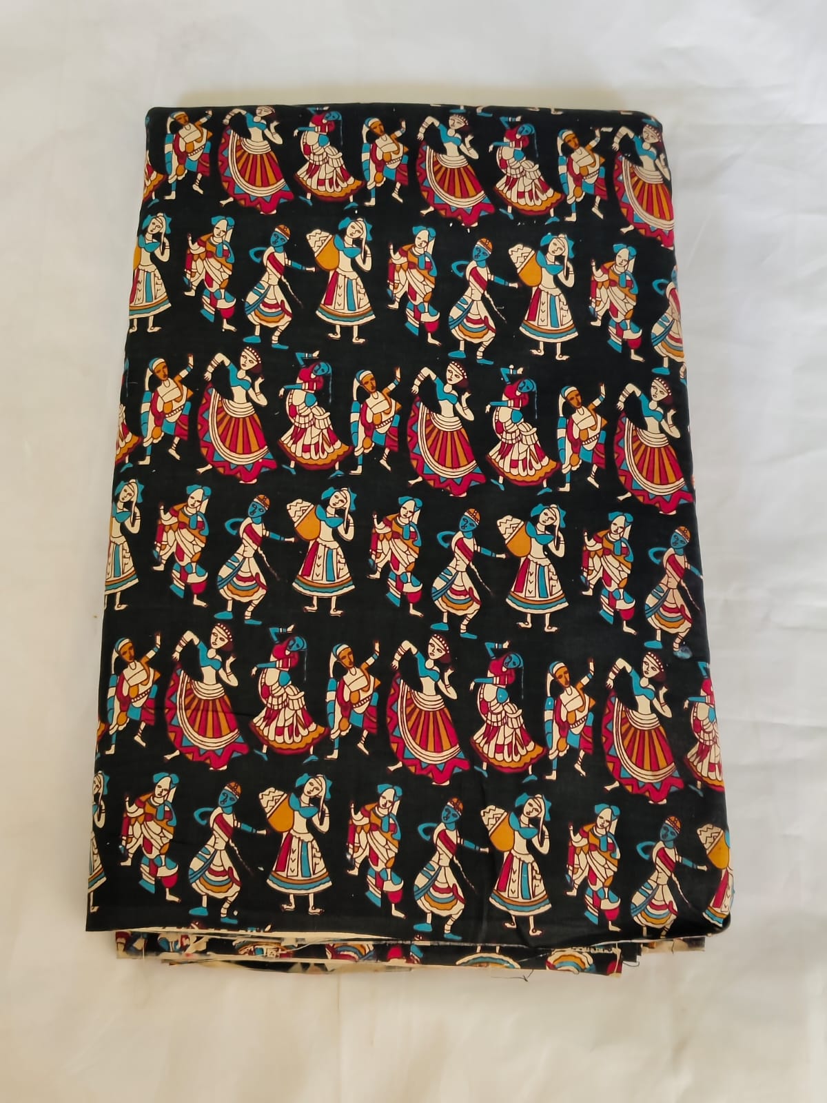 A beautiful folk dance themed printed cotton fabric, showcasing traditional Indian cultural motifs. The fabric is soft, breathable and comfortable for all-day wear. Perfect for boutique tailoring and handcrafted outfits. Ideal for making kurtis, salwar suits, tops, blouses, palazzos, skirts, and kids wear.