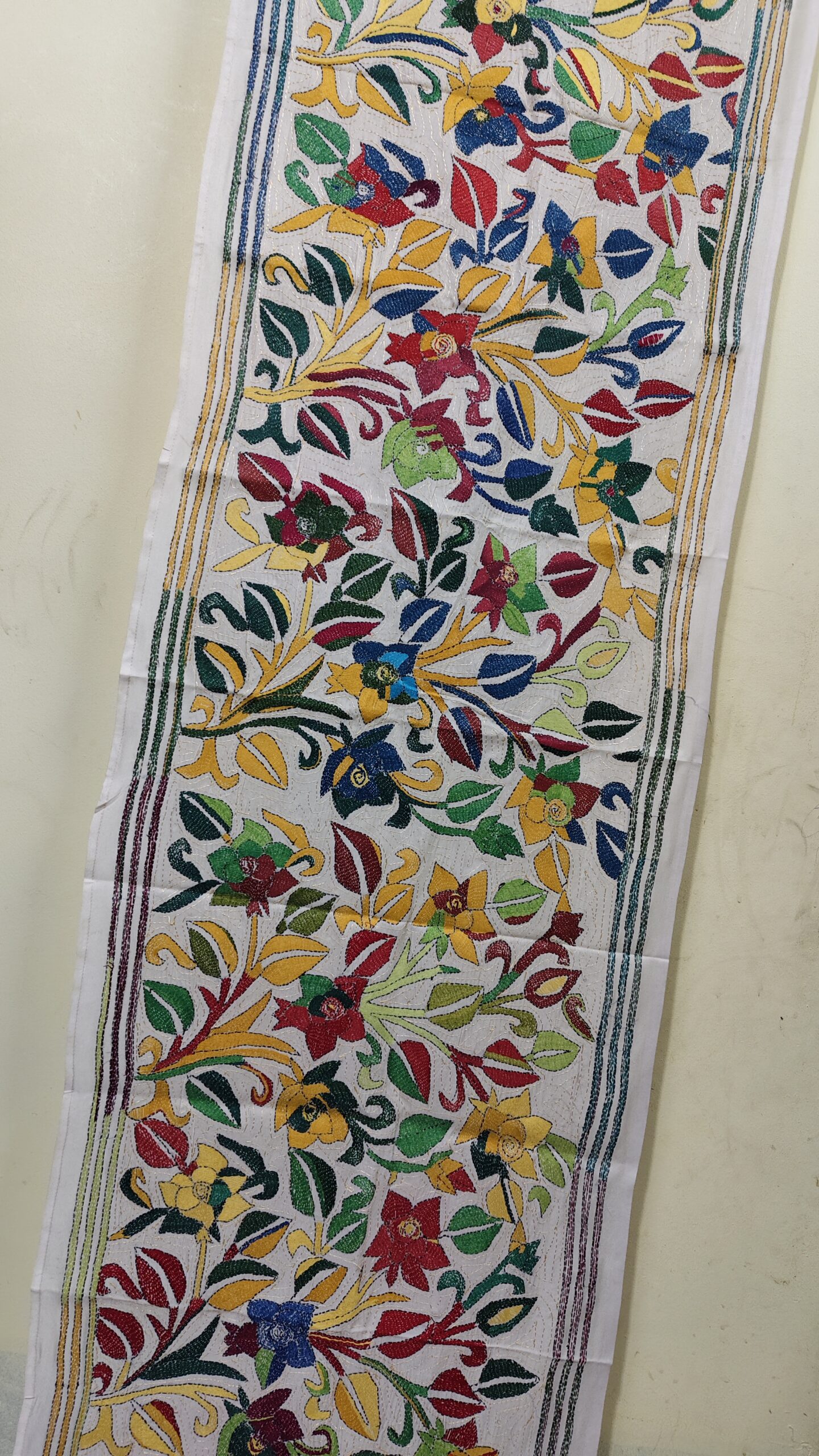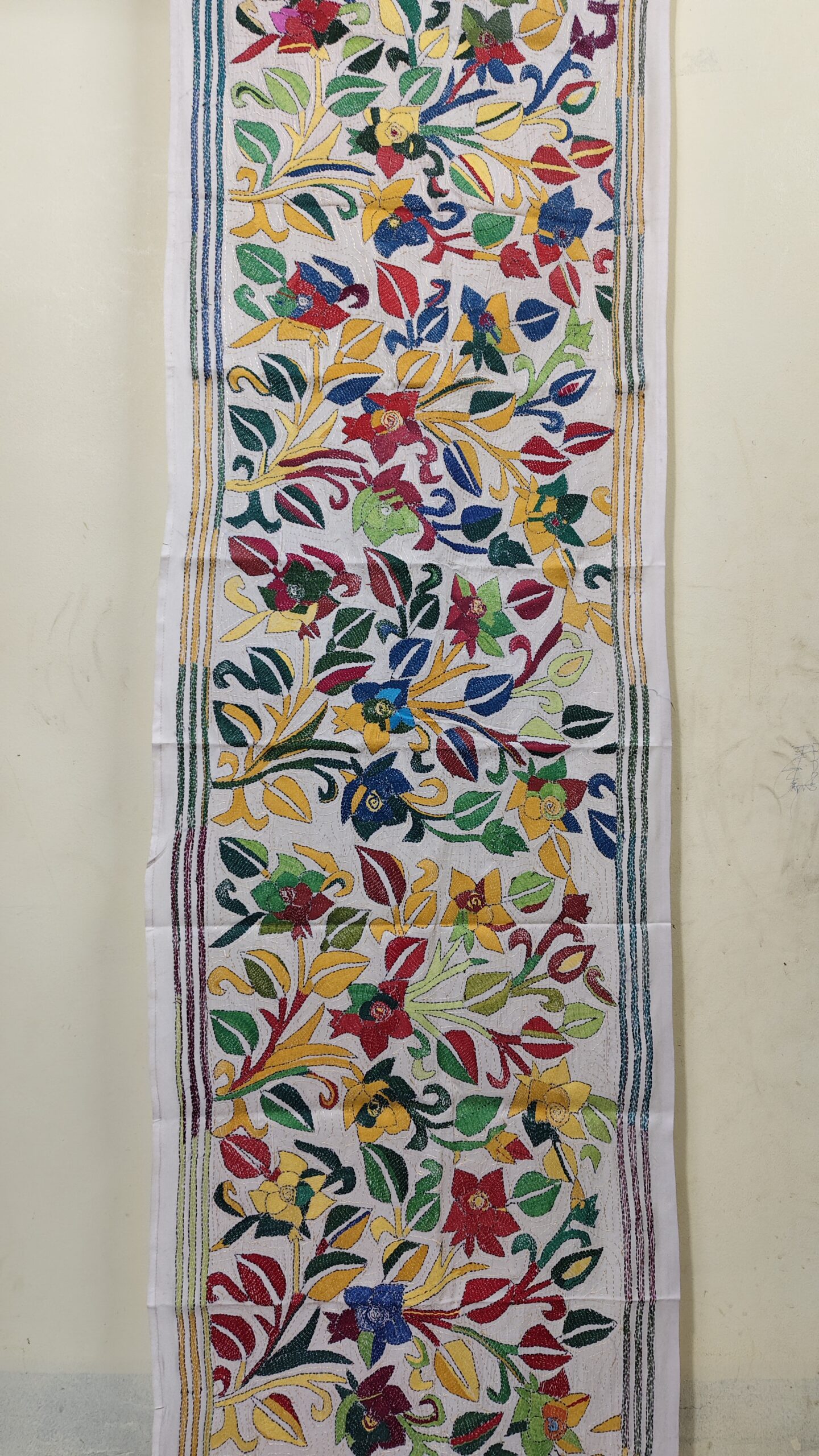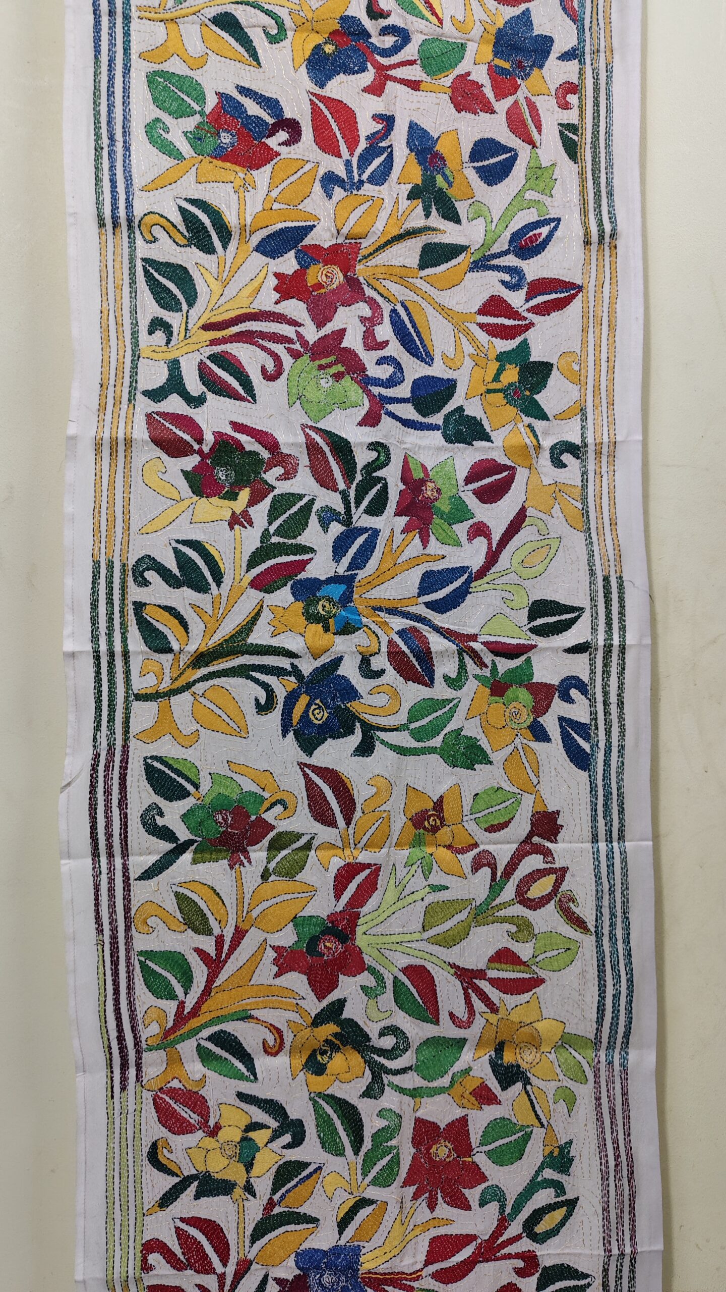 Tussar Silk Kantha Stole with Multicolor Floral Vine Design