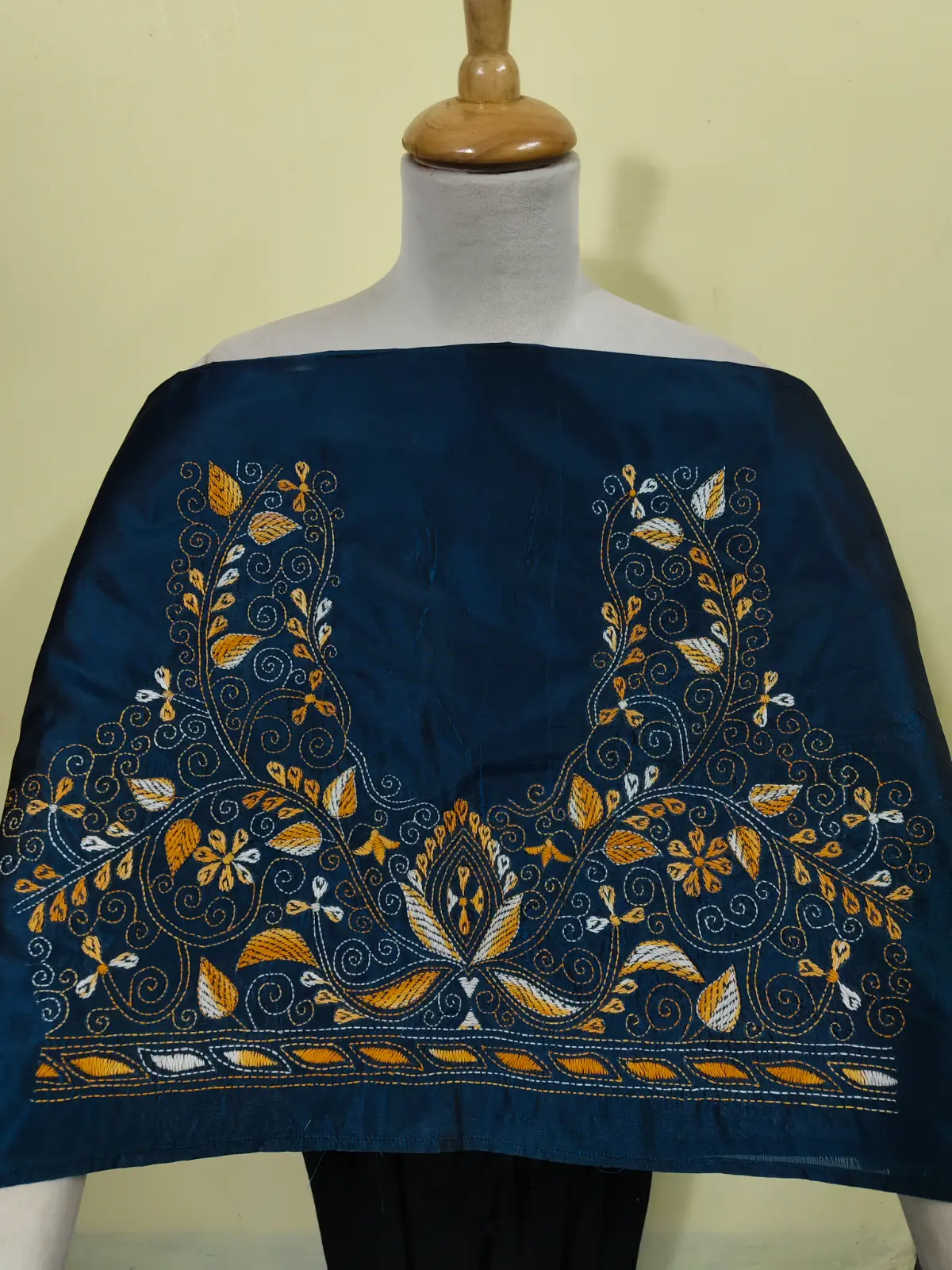 This attractive Kantha stitch blouse piece is made of high-quality silk fabric, which is comfortable and looks beautiful. Hand-stitched with colourful threads in flower and leaf designs, adding a unique traditional touch to your outfit.